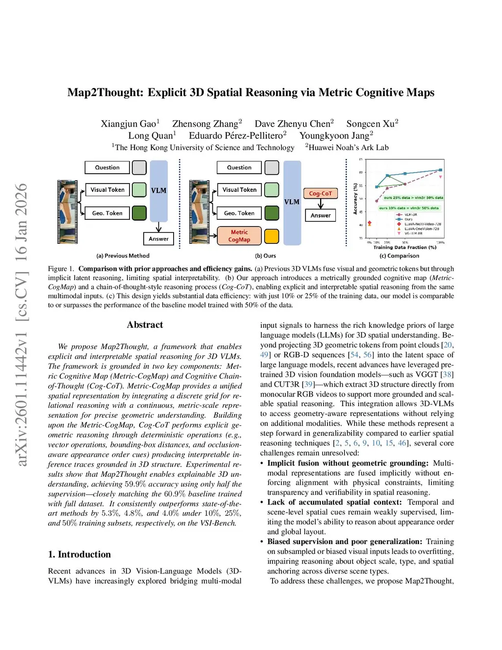 We propose Map2Thought, a framework that enables explicit and interpretable spatial reasoning for 3D VLMs. The framework is grounded in two key components: Metric Cognitive Map (Metric-CogMap) and Cognitive Chain-of-Thought (Cog-CoT). Metric-CogMap provides a unified spatial representation by integrating a discrete grid for relational reasoning with a continuous, metric-scale representation for precise geometric understanding. Building upon the Metric-CogMap, Cog-CoT performs explicit geometric reasoning through deterministic operations, including vector operations, bounding-box distances, and occlusion-aware appearance order cues, producing interpretable inference traces grounded in 3D structure. Experimental results show that Map2Thought enables explainable 3D understanding, achieving 59.9% accuracy using only half the supervision, closely matching the 60.9% baseline trained with the full dataset. It consistently outperforms state-of-the-art methods by 5.3%, 4.8%, and 4.0% under 10%, 25%, and 50% training subsets, respectively, on the VSI-Bench.