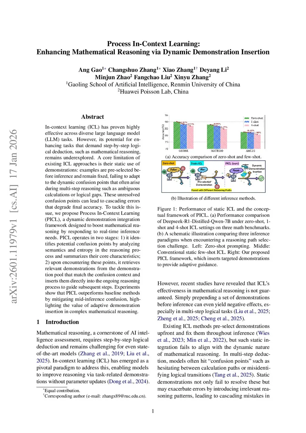 In-context learning (ICL) has proven highly effective across diverse large language model (LLM) tasks. However, its potential for enhancing tasks that demand step-by-step logical deduction, such as mathematical reasoning, remains underexplored. A core limitation of existing ICL approaches is their static use of demonstrations: examples are pre-selected before inference and remain fixed, failing to adapt to the dynamic confusion points that often arise during multi-step reasoning such as ambiguous calculations or logical gaps. These unresolved confusion points can lead to cascading errors that degrade final accuracy. To tackle this issue, we propose Process In-Context Learning (PICL), a dynamic demonstration integration framework designed to boost mathematical reasoning by responding to real-time inference needs. PICL operates in two stages: 1)~it identifies potential confusion points by analyzing semantics and entropy in the reasoning process and summarizes their core characteristics; 2)~upon encountering these points, it retrieves relevant demonstrations from the demonstration pool that match the confusion context and inserts them directly into the ongoing reasoning process to guide subsequent steps. Experiments show that PICL outperforms baseline methods by mitigating mid-inference confusion, highlighting the value of adaptive demonstration insertion in complex mathematical reasoning.