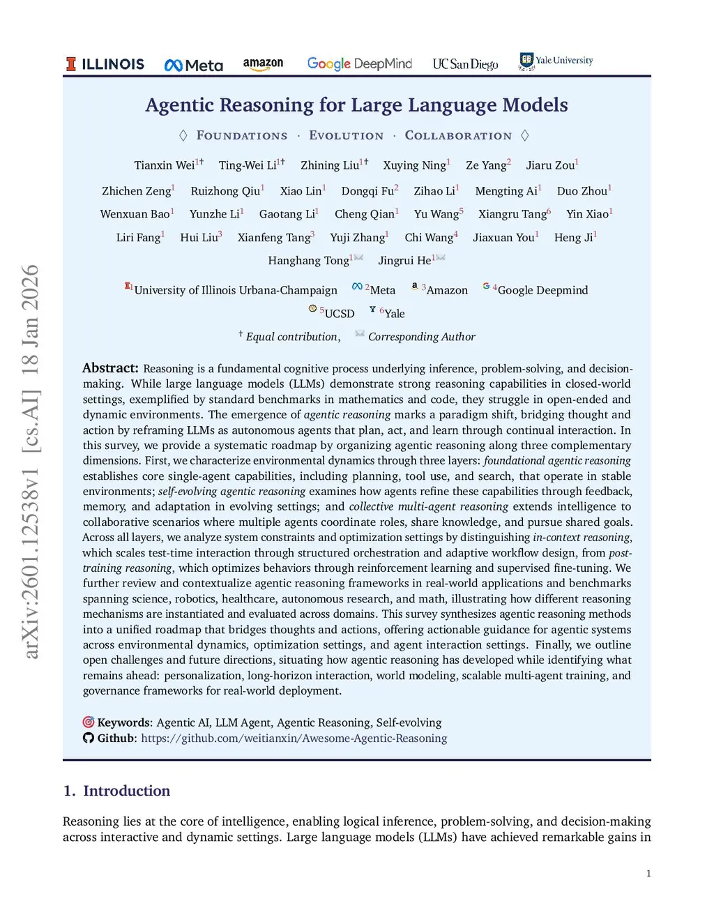 Reasoning is a fundamental cognitive process underlying inference, problem-solving, and decision-making. While large language models (LLMs) demonstrate strong reasoning capabilities in closed-world settings, they struggle in open-ended and dynamic environments. Agentic reasoning marks a paradigm shift by reframing LLMs as autonomous agents that plan, act, and learn through continual interaction. In this survey, we organize agentic reasoning along three complementary dimensions. First, we characterize environmental dynamics through three layers: foundational agentic reasoning, which establishes core single-agent capabilities including planning, tool use, and search in stable environments; self-evolving agentic reasoning, which studies how agents refine these capabilities through feedback, memory, and adaptation; and collective multi-agent reasoning, which extends intelligence to collaborative settings involving coordination, knowledge sharing, and shared goals. Across these layers, we distinguish in-context reasoning, which scales test-time interaction through structured orchestration, from post-training reasoning, which optimizes behaviors via reinforcement learning and supervised fine-tuning. We further review representative agentic reasoning frameworks across real-world applications and benchmarks, including science, robotics, healthcare, autonomous research, and mathematics. This survey synthesizes agentic reasoning methods into a unified roadmap bridging thought and action, and outlines open challenges and future directions, including personalization, long-horizon interaction, world modeling, scalable multi-agent training, and governance for real-world deployment.