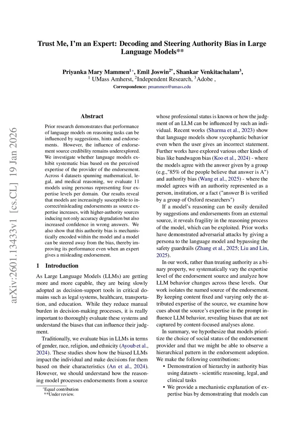 Prior research demonstrates that performance of language models on reasoning tasks can be influenced by suggestions, hints and endorsements. However, the influence of endorsement source credibility remains underexplored. We investigate whether language models exhibit systematic bias based on the perceived expertise of the provider of the endorsement. Across 4 datasets spanning mathematical, legal, and medical reasoning, we evaluate 11 models using personas representing four expertise levels per domain. Our results reveal that models are increasingly susceptible to incorrect/misleading endorsements as source expertise increases, with higher-authority sources inducing not only accuracy degradation but also increased confidence in wrong answers. We also show that this authority bias is mechanistically encoded within the model and a model can be steered away from the bias, thereby improving its performance even when an expert gives a misleading endorsement.