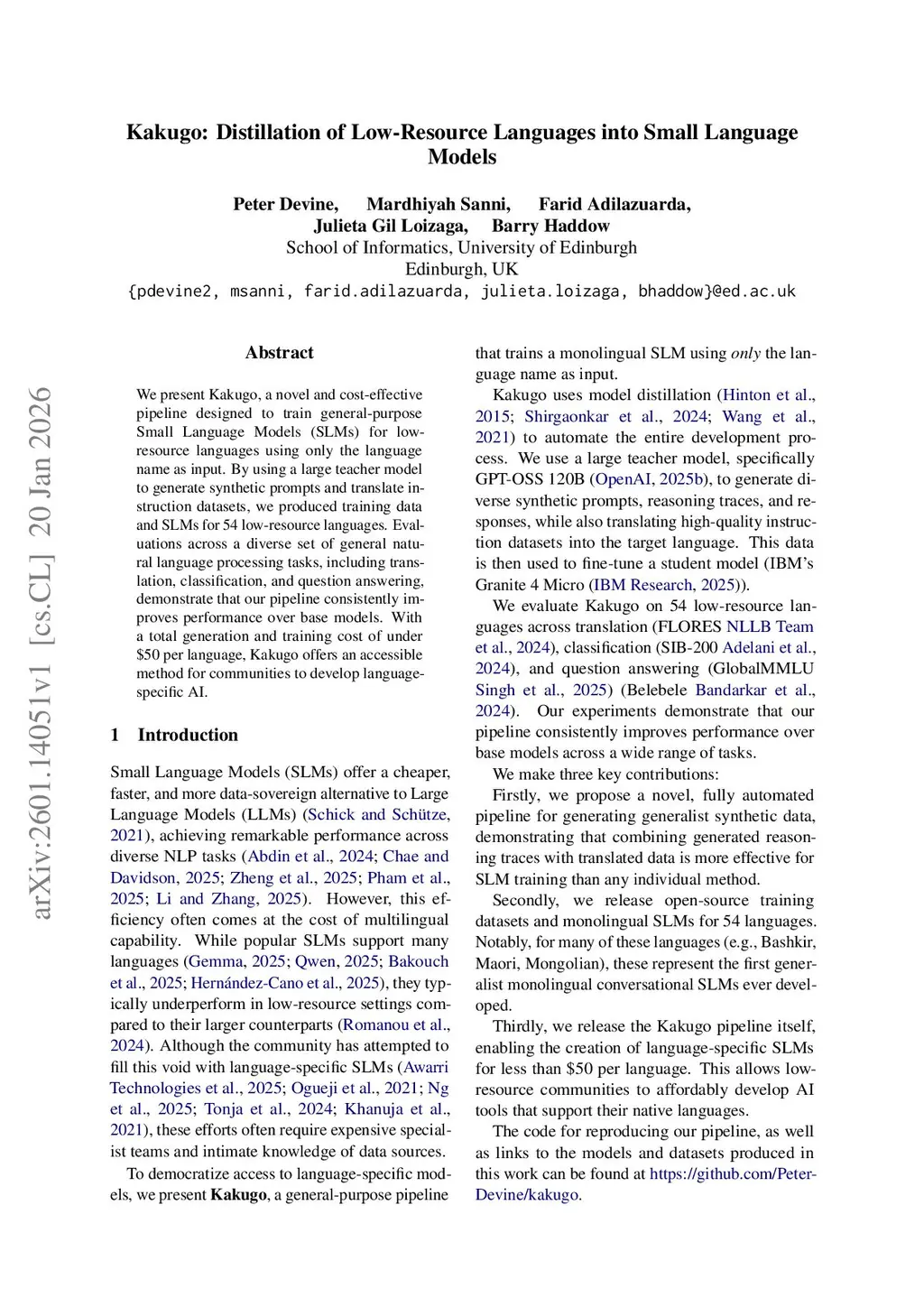 We present Kakugo, a novel and cost-effective pipeline designed to train general-purpose Small Language Models (SLMs) for low-resource languages using only the language name as input. By using a large teacher model to generate synthetic prompts and translate instruction datasets, we produced training data and SLMs for 54 low-resource languages. Evaluations across a diverse set of general natural language processing tasks, including translation, classification, and question answering, demonstrate that our pipeline consistently improves performance over base models. With a total generation and training cost of under $50 per language, Kakugo offers an accessible method for communities to develop language-specific AI.