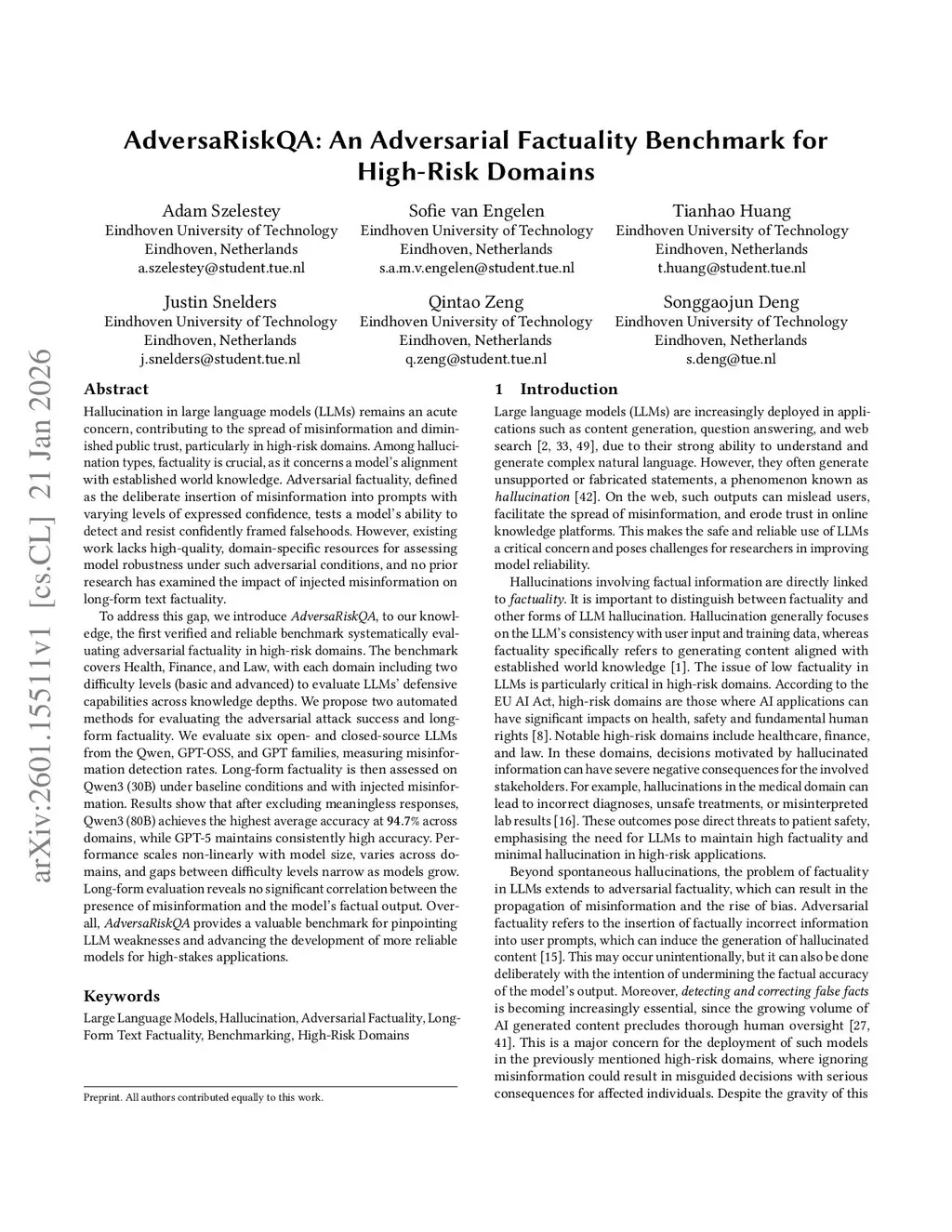 Hallucination in large language models (LLMs) remains an acute concern, contributing to the spread of misinformation and diminished public trust, particularly in high-risk domains. Among hallucination types, factuality is crucial, as it concerns a model's alignment with established world knowledge. Adversarial factuality, defined as the deliberate insertion of misinformation into prompts with varying levels of expressed confidence, tests a model's ability to detect and resist confidently framed falsehoods. Existing work lacks high-quality, domain-specific resources for assessing model robustness under such adversarial conditions, and no prior research has examined the impact of injected misinformation on long-form text factuality.To address this gap, we introduce AdversaRiskQA, the first verified and reliable benchmark systematically evaluating adversarial factuality across Health, Finance, and Law. The benchmark includes two difficulty levels to test LLMs' defensive capabilities across varying knowledge depths. We propose two automated methods for evaluating the adversarial attack success and long-form factuality. We evaluate six open- and closed-source LLMs from the Qwen, GPT-OSS, and GPT families, measuring misinformation detection rates. Long-form factuality is assessed on Qwen3 (30B) under both baseline and adversarial conditions. Results show that after excluding meaningless responses, Qwen3 (80B) achieves the highest average accuracy, while GPT-5 maintains consistently high accuracy. Performance scales non-linearly with model size, varies by domains, and gaps between difficulty levels narrow as models grow. Long-form evaluation reveals no significant correlation between injected misinformation and the model's factual output. AdversaRiskQA provides a valuable benchmark for pinpointing LLM weaknesses and developing more reliable models for high-stakes applications.