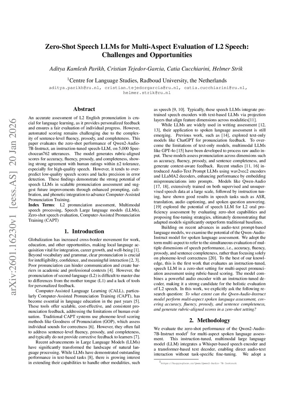 An accurate assessment of L2 English pronunciation is crucial for language learning, as it provides personalized feedback and ensures a fair evaluation of individual progress. However, automated scoring remains challenging due to the complexity of sentence-level fluency, prosody, and completeness. This paper evaluates the zero-shot performance of Qwen2-Audio-7B-Instruct, an instruction-tuned speech-LLM, on 5,000 Speechocean762 utterances. The model generates rubric-aligned scores for accuracy, fluency, prosody, and completeness, showing strong agreement with human ratings within +-2 tolerance, especially for high-quality speech. However, it tends to overpredict low-quality speech scores and lacks precision in error detection. These findings demonstrate the strong potential of speech LLMs in scalable pronunciation assessment and suggest future improvements through enhanced prompting, calibration, and phonetic integration to advance Computer-Assisted Pronunciation Training.