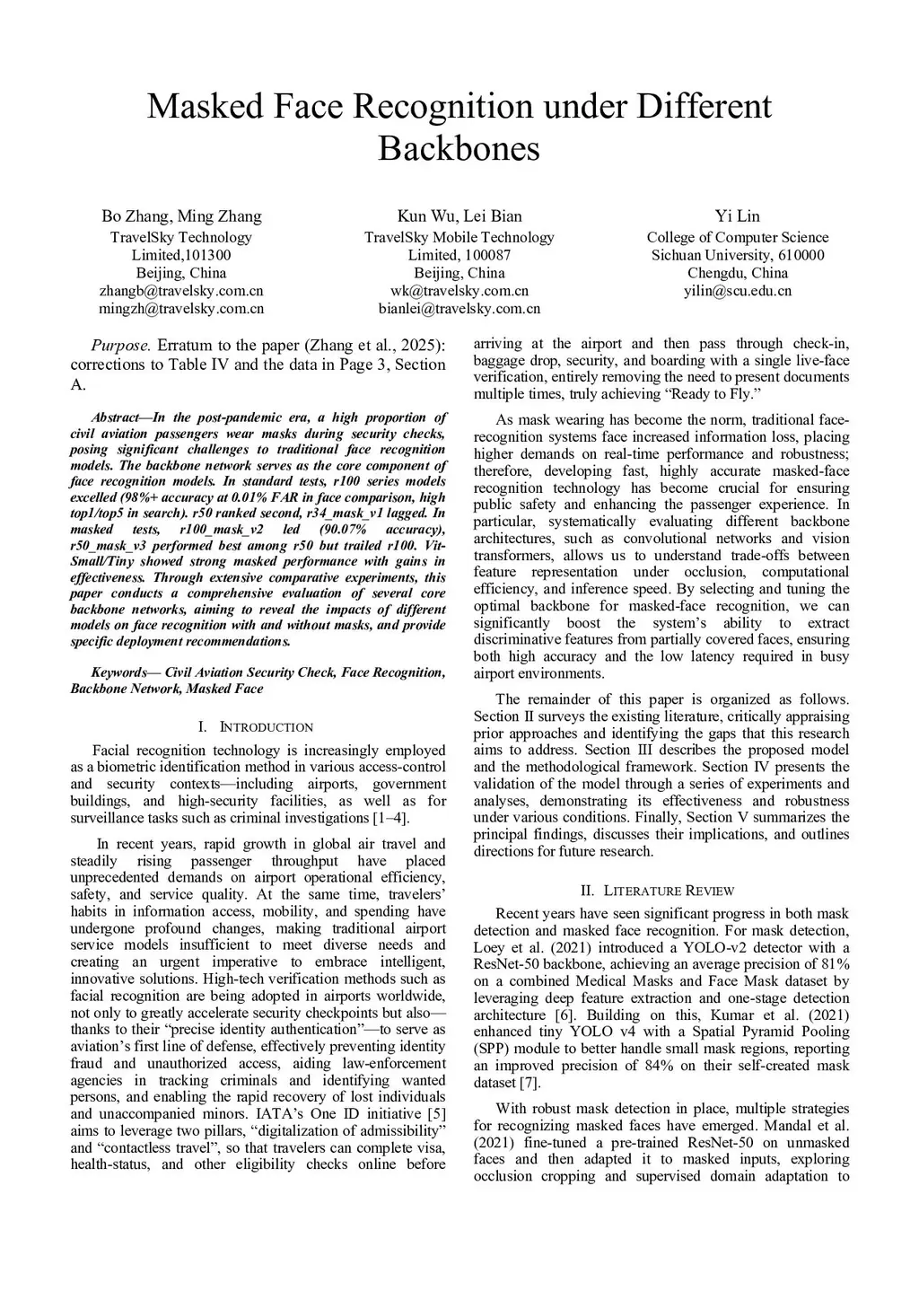 Erratum to the paper (Zhang et al., 2025): corrections to Table IV and the data in Page 3, Section A. In the post-pandemic era, a high proportion of civil aviation passengers wear masks during security checks, posing significant challenges to traditional face recognition models. The backbone network serves as the core component of face recognition models. In standard tests, r100 series models excelled (98%+ accuracy at 0.01% FAR in face comparison, high top1/top5 in search). r50 ranked second, r34_mask_v1 lagged. In masked tests, r100_mask_v2 led (90.07% accuracy), r50_mask_v3 performed best among r50 but trailed r100. Vit-Small/Tiny showed strong masked performance with gains in effectiveness. Through extensive comparative experiments, this paper conducts a comprehensive evaluation of several core backbone networks, aiming to reveal the impacts of different models on face recognition with and without masks, and provide specific deployment recommendations.