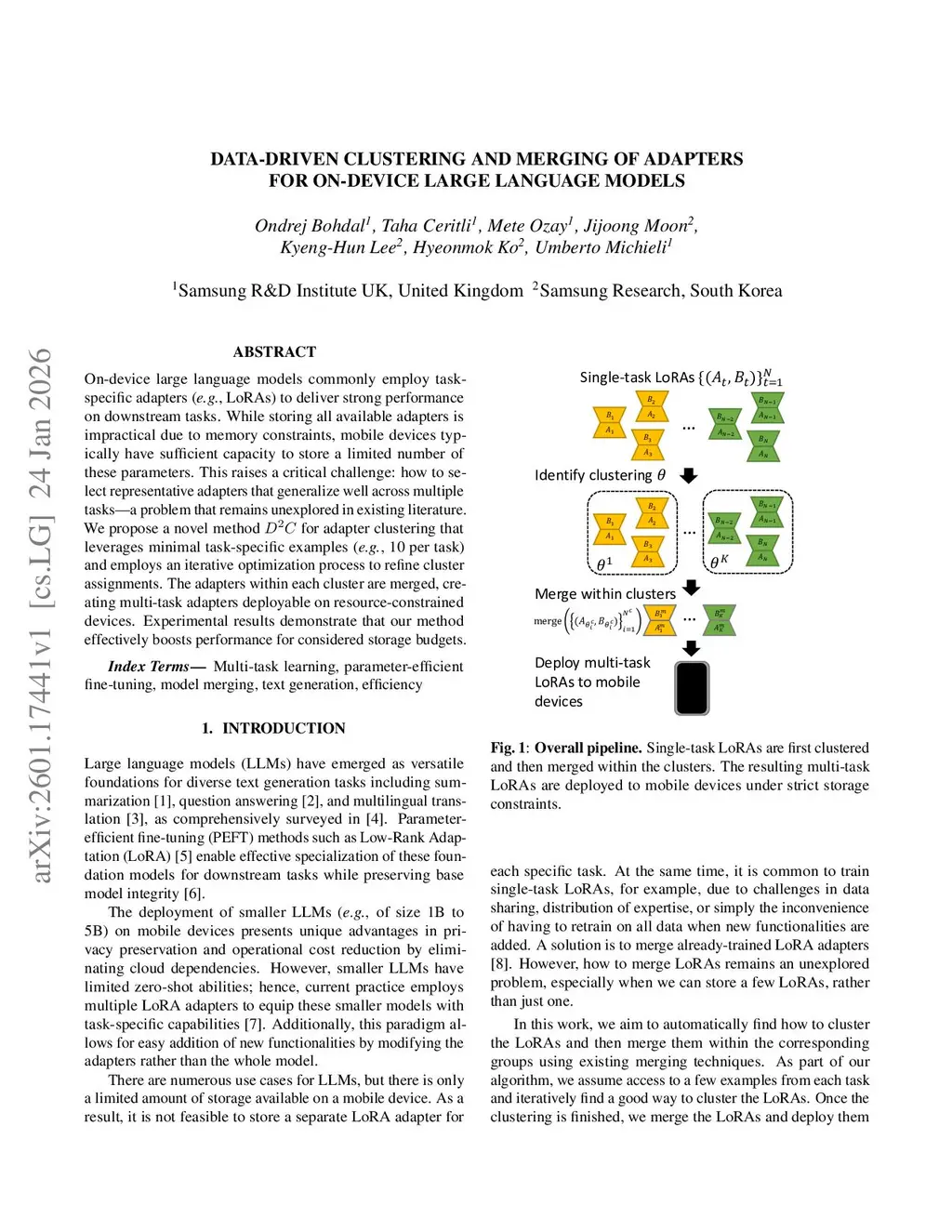On-device large language models commonly employ task-specific adapters (e.g., LoRAs) to deliver strong performance on downstream tasks. While storing all available adapters is impractical due to memory constraints, mobile devices typically have sufficient capacity to store a limited number of these parameters. This raises a critical challenge: how to select representative adapters that generalize well across multiple tasks - a problem that remains unexplored in existing literature. We propose a novel method D2C for adapter clustering that leverages minimal task-specific examples (e.g., 10 per task) and employs an iterative optimization process to refine cluster assignments. The adapters within each cluster are merged, creating multi-task adapters deployable on resource-constrained devices. Experimental results demonstrate that our method effectively boosts performance for considered storage budgets.