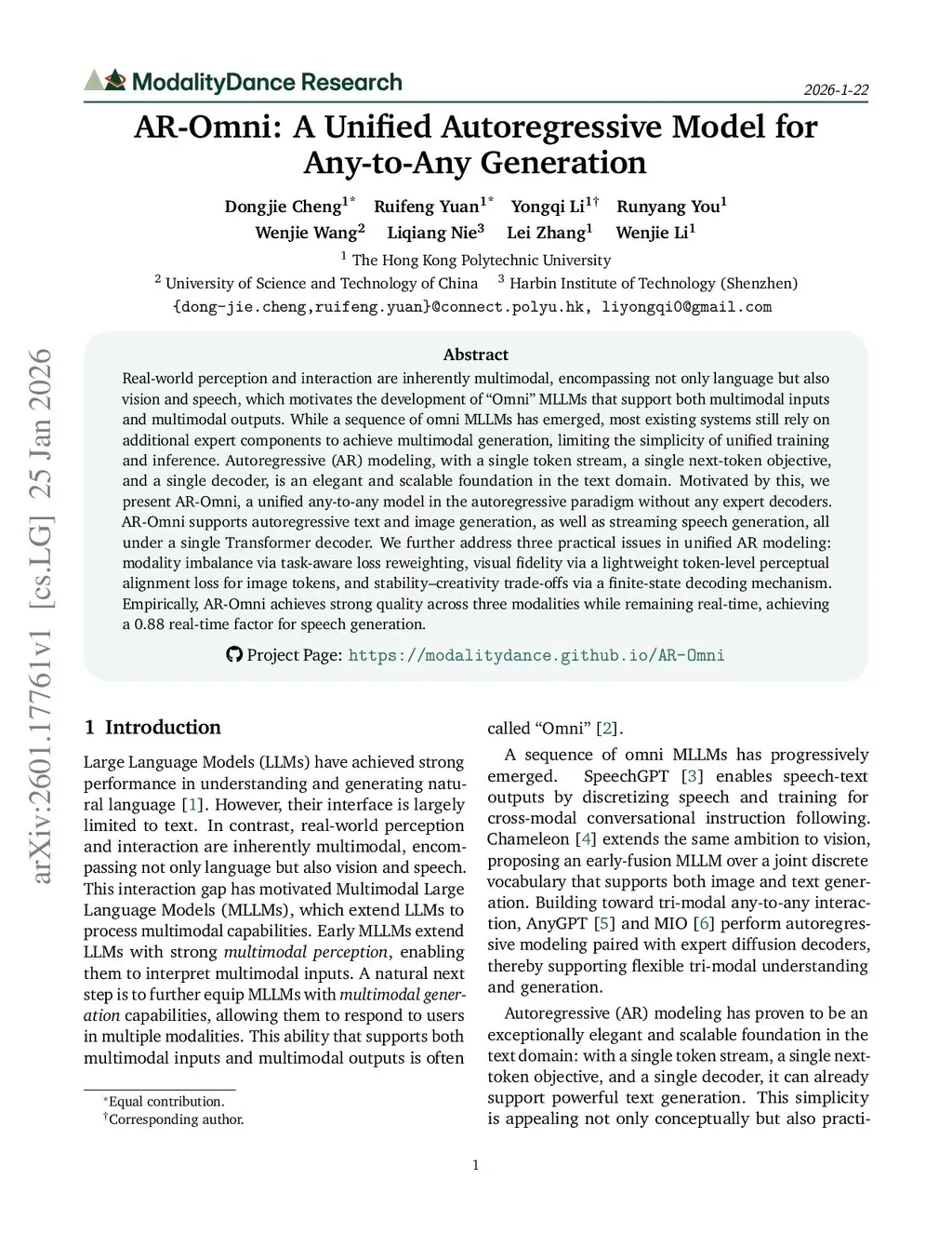 Real-world perception and interaction are inherently multimodal, encompassing not only language but also vision and speech, which motivates the development of "Omni" MLLMs that support both multimodal inputs and multimodal outputs. While a sequence of omni MLLMs has emerged, most existing systems still rely on additional expert components to achieve multimodal generation, limiting the simplicity of unified training and inference. Autoregressive (AR) modeling, with a single token stream, a single next-token objective, and a single decoder, is an elegant and scalable foundation in the text domain. Motivated by this, we present AR-Omni, a unified any-to-any model in the autoregressive paradigm without any expert decoders. AR-Omni supports autoregressive text and image generation, as well as streaming speech generation, all under a single Transformer decoder. We further address three practical issues in unified AR modeling: modality imbalance via task-aware loss reweighting, visual fidelity via a lightweight token-level perceptual alignment loss for image tokens, and stability-creativity trade-offs via a finite-state decoding mechanism. Empirically, AR-Omni achieves strong quality across three modalities while remaining real-time, achieving a 0.88 real-time factor for speech generation.