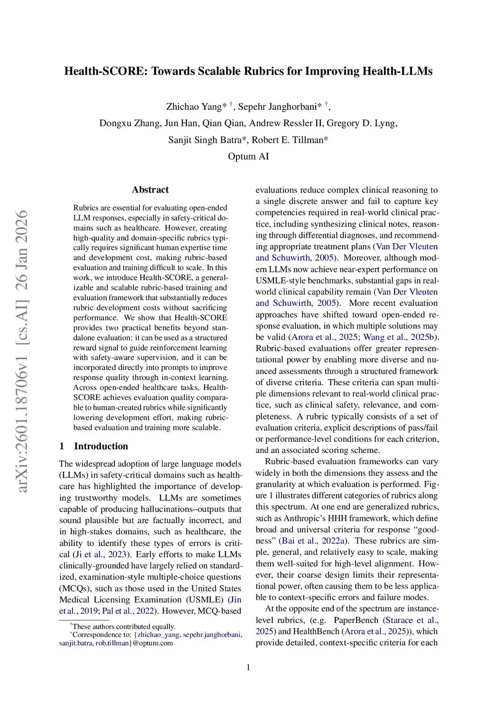 Rubrics are essential for evaluating open-ended LLM responses, especially in safety-critical domains such as healthcare. However, creating high-quality and domain-specific rubrics typically requires significant human expertise time and development cost, making rubric-based evaluation and training difficult to scale. In this work, we introduce Health-SCORE, a generalizable and scalable rubric-based training and evaluation framework that substantially reduces rubric development costs without sacrificing performance. We show that Health-SCORE provides two practical benefits beyond standalone evaluation: it can be used as a structured reward signal to guide reinforcement learning with safety-aware supervision, and it can be incorporated directly into prompts to improve response quality through in-context learning. Across open-ended healthcare tasks, Health-SCORE achieves evaluation quality comparable to human-created rubrics while significantly lowering development effort, making rubric-based evaluation and training more scalable.