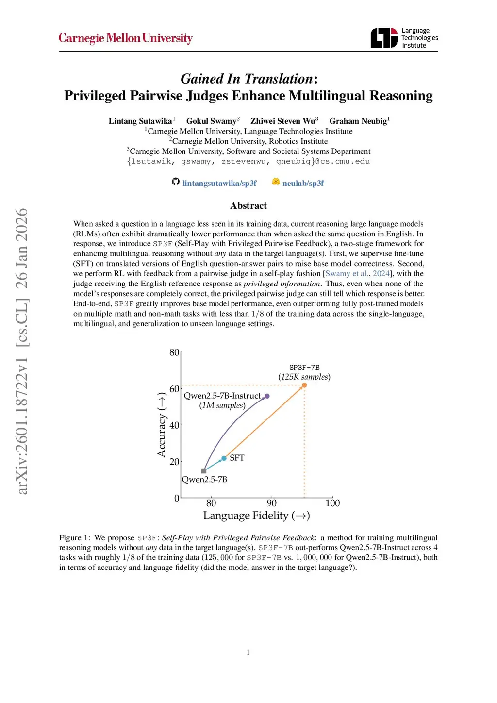 When asked a question in a language less seen in its training data, current reasoning large language models (RLMs) often exhibit dramatically lower performance than when asked the same question in English. In response, we introduce \texttt{SP3F} (Self-Play with Privileged Pairwise Feedback), a two-stage framework for enhancing multilingual reasoning without \textit{any} data in the target language(s). First, we supervise fine-tune (SFT) on translated versions of English question-answer pairs to raise base model correctness. Second, we perform RL with feedback from a pairwise judge in a self-play fashion, with the judge receiving the English reference response as \textit{privileged information}. Thus, even when none of the model's responses are completely correct, the privileged pairwise judge can still tell which response is better. End-to-end, \texttt{SP3F} greatly improves base model performance, even outperforming fully post-trained models on multiple math and non-math tasks with less thanof the training data across the single-language, multilingual, and generalization to unseen language settings.