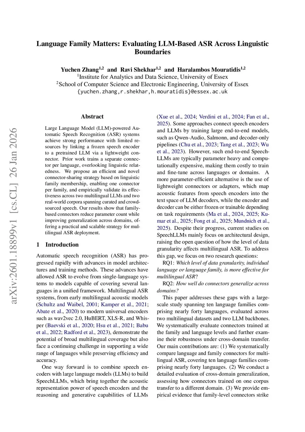 Large Language Model (LLM)-powered Automatic Speech Recognition (ASR) systems achieve strong performance with limited resources by linking a frozen speech encoder to a pretrained LLM via a lightweight connector. Prior work trains a separate connector per language, overlooking linguistic relatedness. We propose an efficient and novel connector-sharing strategy based on linguistic family membership, enabling one connector per family, and empirically validate its effectiveness across two multilingual LLMs and two real-world corpora spanning curated and crowd-sourced speech. Our results show that family-based connectors reduce parameter count while improving generalization across domains, offering a practical and scalable strategy for multilingual ASR deployment.