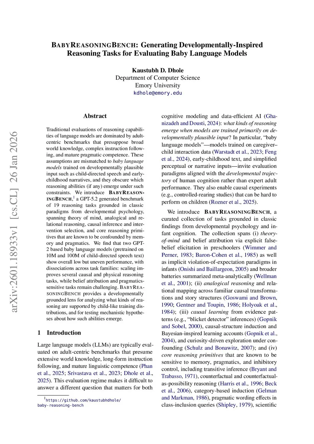 Traditional evaluations of reasoning capabilities of language models are dominated by adult-centric benchmarks that presuppose broad world knowledge, complex instruction following, and mature pragmatic competence. These assumptions are mismatched to baby language models trained on developmentally plausible input such as child-directed speech and early-childhood narratives, and they obscure which reasoning abilities (if any) emerge under such constraints. We introduce BabyReasoningBench, a GPT-5.2 generated benchmark of 19 reasoning tasks grounded in classic paradigms from developmental psychology, spanning theory of mind, analogical and relational reasoning, causal inference and intervention selection, and core reasoning primitives that are known to be confounded by memory and pragmatics. We find that two GPT-2 based baby language models (pretrained on 10M and 100M of child-directed speech text) show overall low but uneven performance, with dissociations across task families: scaling improves several causal and physical reasoning tasks, while belief attribution and pragmatics-sensitive tasks remain challenging. BabyReasoningBench provides a developmentally grounded lens for analyzing what kinds of reasoning are supported by child-like training distributions, and for testing mechanistic hypotheses about how such abilities emerge.