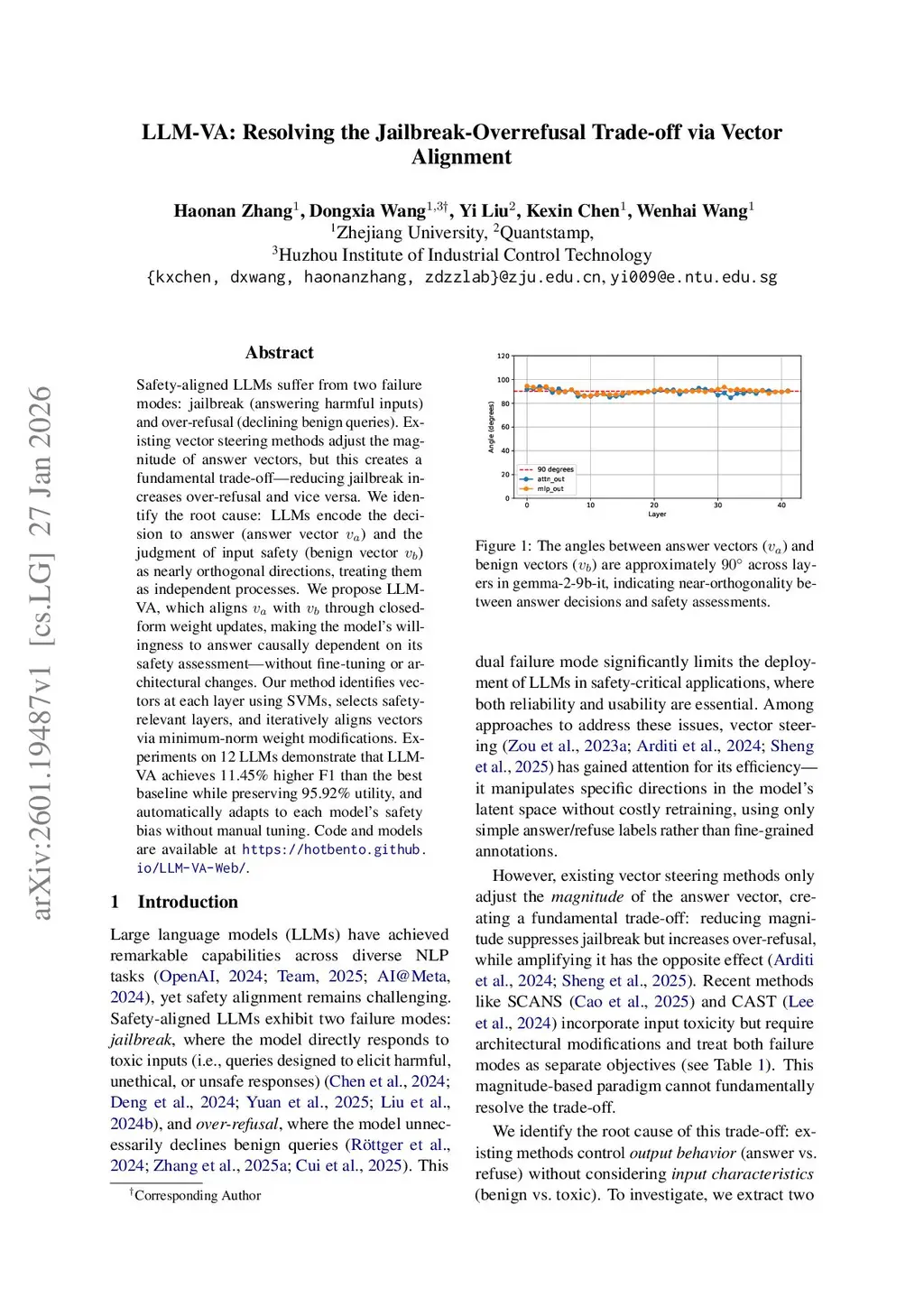 Safety-aligned LLMs suffer from two failure modes: jailbreak (answering harmful inputs) and over-refusal (declining benign queries). Existing vector steering methods adjust the magnitude of answer vectors, but this creates a fundamental trade-off -- reducing jailbreak increases over-refusal and vice versa. We identify the root cause: LLMs encode the decision to answer (answer vector ) and the judgment of input safety (benign vector ) as nearly orthogonal directions, treating them as independent processes. We propose LLM-VA, which aligns with through closed-form weight updates, making the model's willingness to answer causally dependent on its safety assessment -- without fine-tuning or architectural changes. Our method identifies vectors at each layer using SVMs, selects safety-relevant layers, and iteratively aligns vectors via minimum-norm weight modifications. Experiments on 12 LLMs demonstrate that LLM-VA achieves 11.45% higher F1 than the best baseline while preserving 95.92% utility, and automatically adapts to each model's safety bias without manual tuning. Code and models are available atthis https URL.