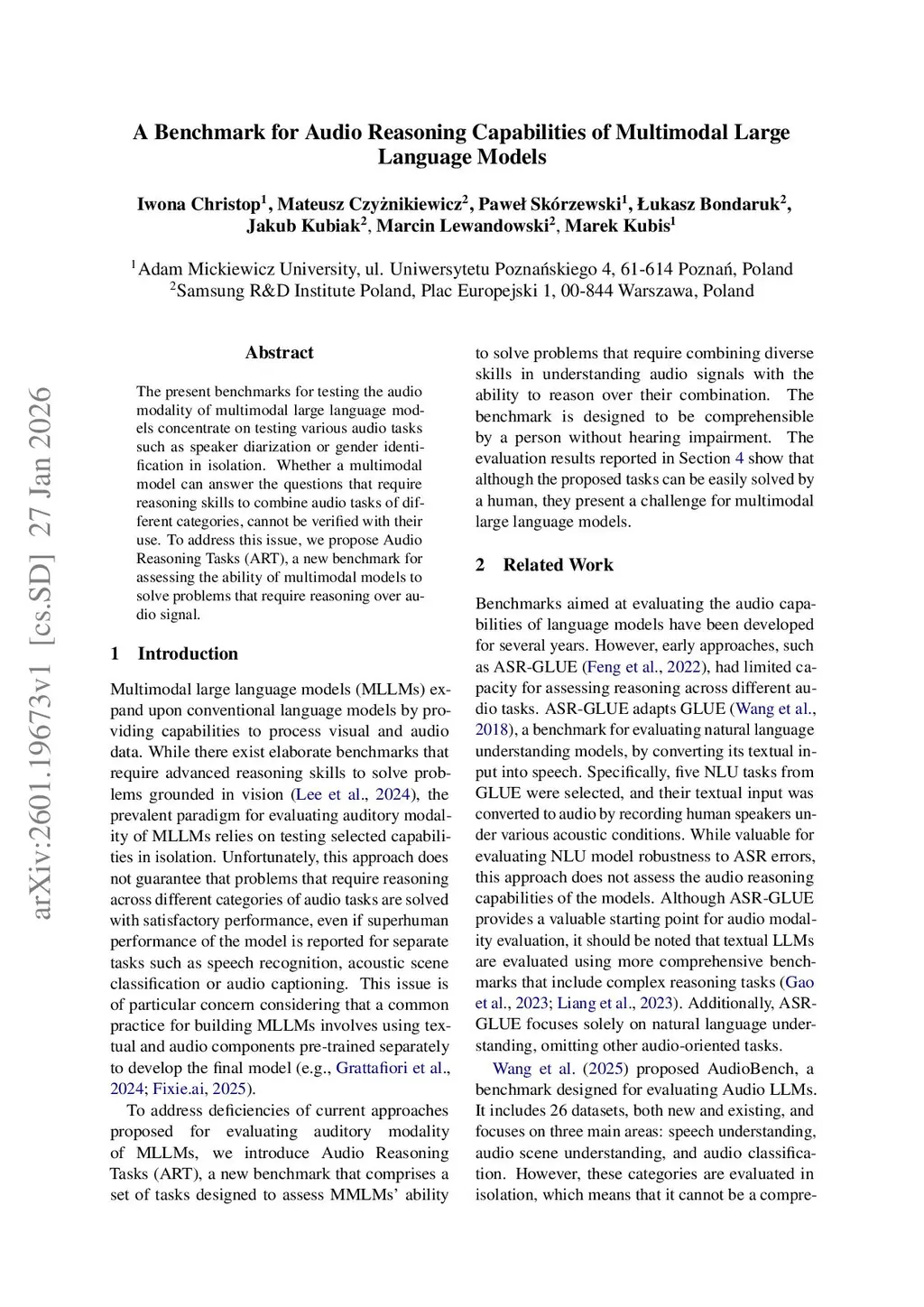 The present benchmarks for testing the audio modality of multimodal large language models concentrate on testing various audio tasks such as speaker diarization or gender identification in isolation. Whether a multimodal model can answer the questions that require reasoning skills to combine audio tasks of different categories, cannot be verified with their use. To address this issue, we propose Audio Reasoning Tasks (ART), a new benchmark for assessing the ability of multimodal models to solve problems that require reasoning over audio signal.