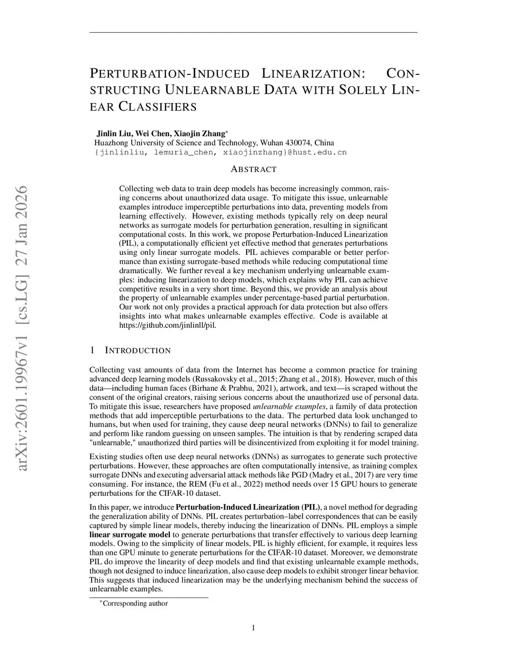 Collecting web data to train deep models has become increasingly common, raising concerns about unauthorized data usage. To mitigate this issue, unlearnable examples introduce imperceptible perturbations into data, preventing models from learning effectively. However, existing methods typically rely on deep neural networks as surrogate models for perturbation generation, resulting in significant computational costs. In this work, we propose Perturbation-Induced Linearization (PIL), a computationally efficient yet effective method that generates perturbations using only linear surrogate models. PIL achieves comparable or better performance than existing surrogate-based methods while reducing computational time dramatically. We further reveal a key mechanism underlying unlearnable examples: inducing linearization to deep models, which explains why PIL can achieve competitive results in a very short time. Beyond this, we provide an analysis about the property of unlearnable examples under percentage-based partial perturbation. Our work not only provides a practical approach for data protection but also offers insights into what makes unlearnable examples effective.