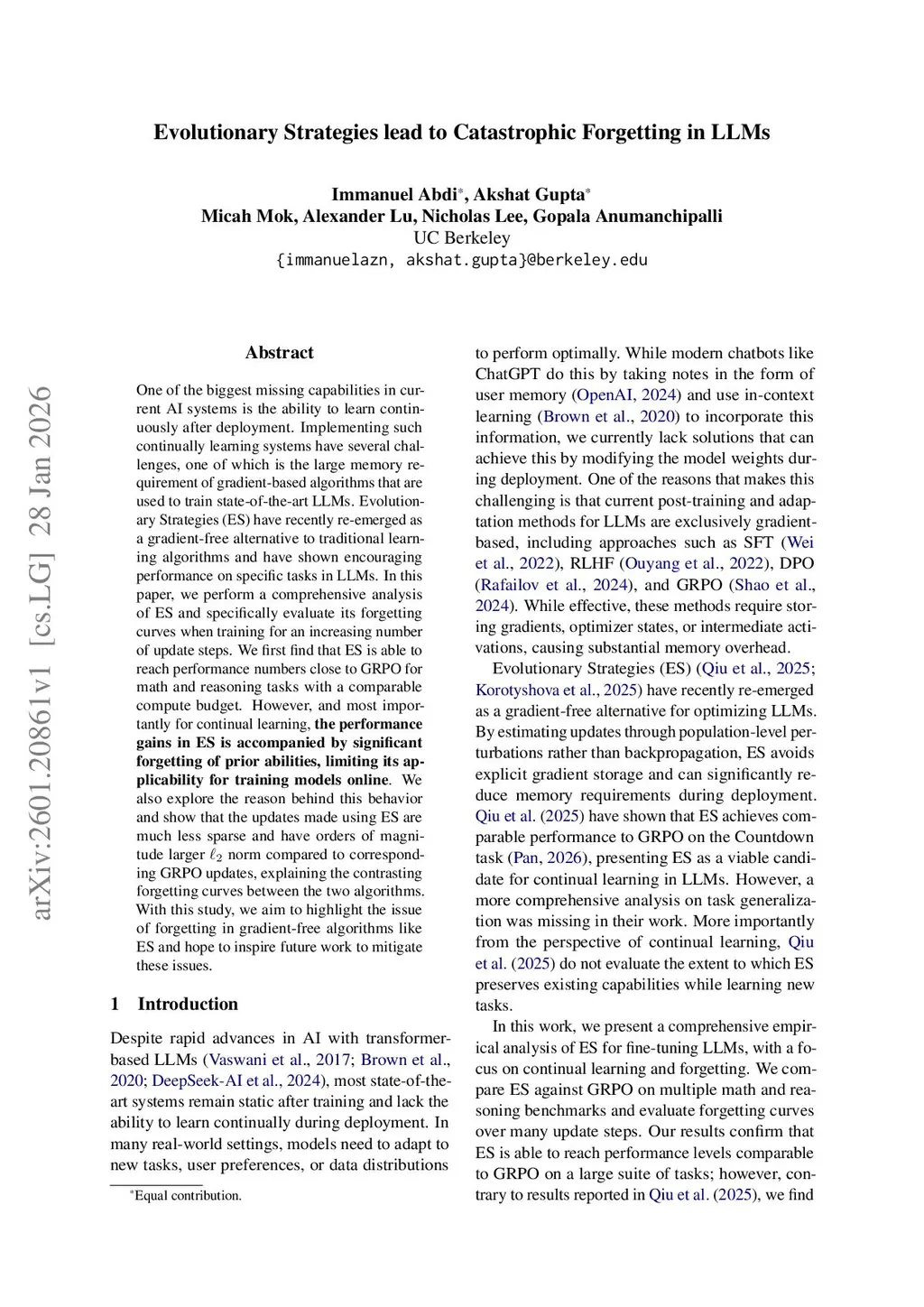 Evolutionary Strategies lead to Catastrophic Forgetting in LLMs