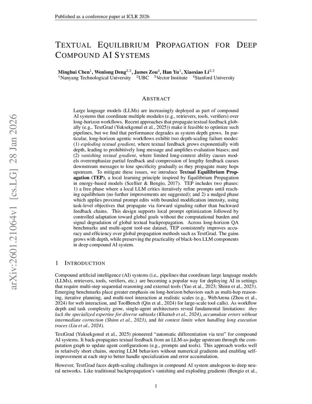 Large language models (LLMs) are increasingly deployed as part of compound AI systems that coordinate multiple modules (e.g., retrievers, tools, verifiers) over long-horizon workflows. Recent approaches that propagate textual feedback globally (e.g., TextGrad) make it feasible to optimize such pipelines, but we find that performance degrades as system depth grows. In particular, long-horizon agentic workflows exhibit two depth-scaling failure modes: 1) exploding textual gradient, where textual feedback grows exponentially with depth, leading to prohibitively long message and amplifies evaluation biases; and 2) vanishing textual gradient, where limited long-context ability causes models overemphasize partial feedback and compression of lengthy feedback causes downstream messages to lose specificity gradually as they propagate many hops upstream. To mitigate these issues, we introduce Textual Equilibrium Propagation (TEP), a local learning principle inspired by Equilibrium Propagation in energy-based models. TEP includes two phases: 1) a free phase where a local LLM critics iteratively refine prompts until reaching equilibrium (no further improvements are suggested); and 2) a nudged phase which applies proximal prompt edits with bounded modification intensity, using task-level objectives that propagate via forward signaling rather than backward feedback chains. This design supports local prompt optimization followed by controlled adaptation toward global goals without the computational burden and signal degradation of global textual backpropagation. Across long-horizon QA benchmarks and multi-agent tool-use dataset, TEP consistently improves accuracy and efficiency over global propagation methods such as TextGrad. The gains grows with depth, while preserving the practicality of black-box LLM components in deep compound AI system.