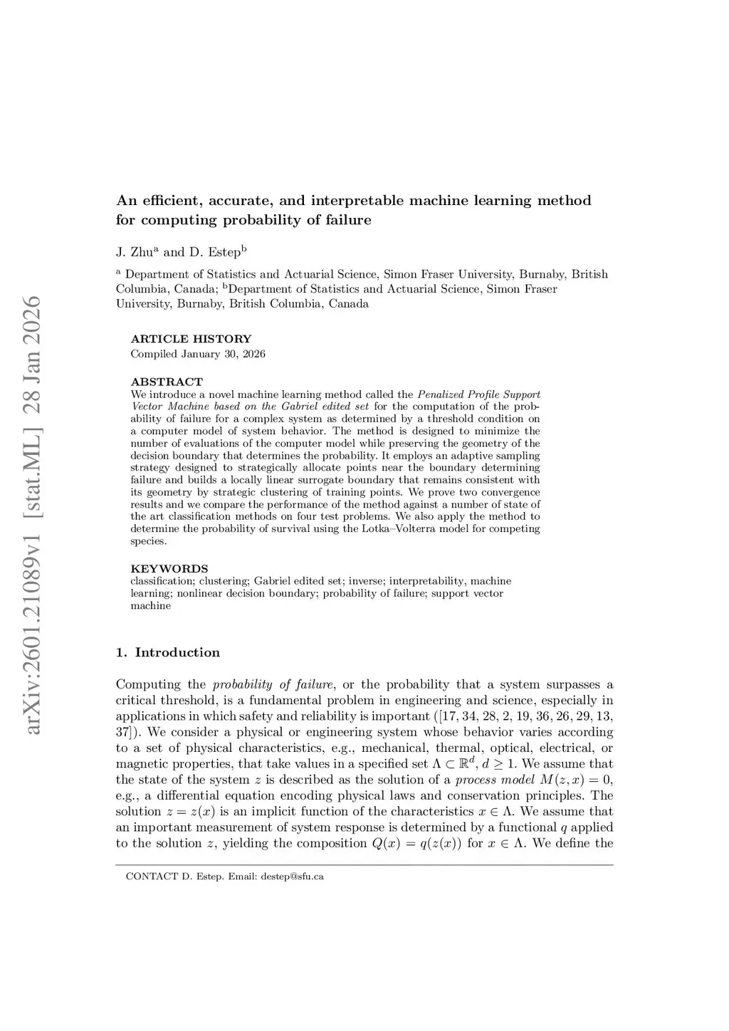 We introduce a novel machine learning method called the Penalized Profile Support Vector Machine based on the Gabriel edited set for the computation of the probability of failure for a complex system as determined by a threshold condition on a computer model of system behavior. The method is designed to minimize the number of evaluations of the computer model while preserving the geometry of the decision boundary that determines the probability. It employs an adaptive sampling strategy designed to strategically allocate points near the boundary determining failure and builds a locally linear surrogate boundary that remains consistent with its geometry by strategic clustering of training points. We prove two convergence results and we compare the performance of the method against a number of state of the art classification methods on four test problems. We also apply the method to determine the probability of survival using the Lotka--Volterra model for competing species.