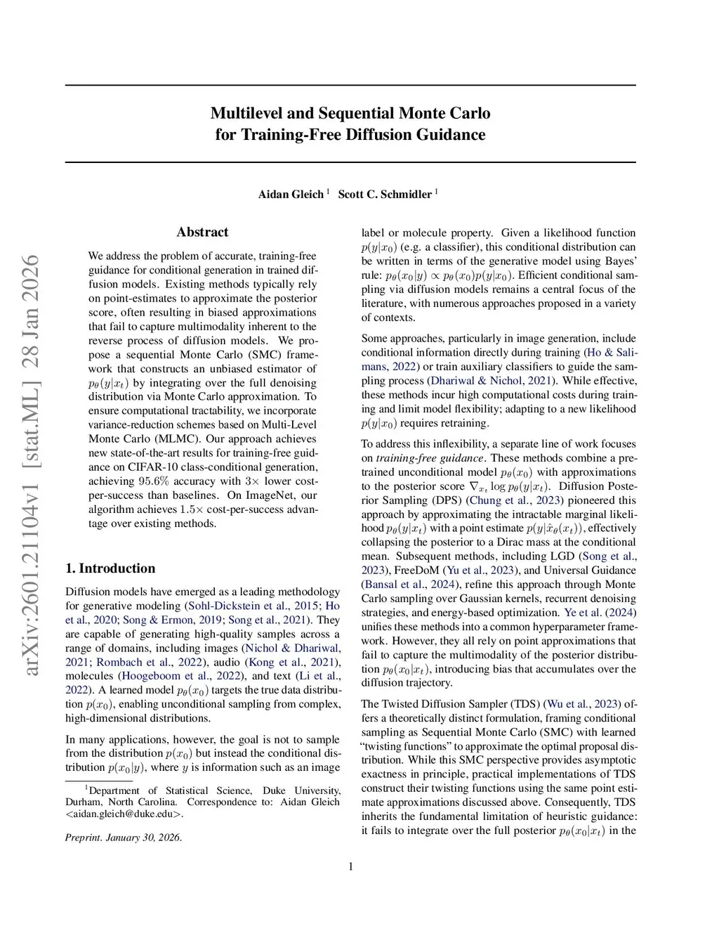 We address the problem of accurate, training-free guidance for conditional generation in trained diffusion models. Existing methods typically rely on point-estimates to approximate the posterior score, often resulting in biased approximations that fail to capture multimodality inherent to the reverse process of diffusion models. We propose a sequential Monte Carlo (SMC) framework that constructs an unbiased estimator of by integrating over the full denoising distribution via Monte Carlo approximation. To ensure computational tractability, we incorporate variance-reduction schemes based on Multi-Level Monte Carlo (MLMC). Our approach achieves new state-of-the-art results for training-free guidance on CIFAR-10 class-conditional generation, achieving accuracy with lower cost-per-success than baselines. On ImageNet, our algorithm achieves cost-per-success advantage over existing methods.