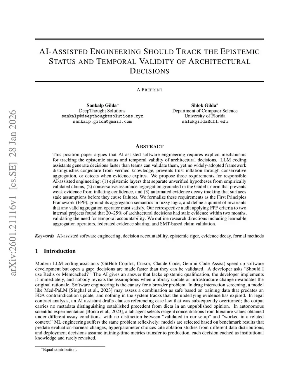 This position paper argues that AI-assisted software engineering requires explicit mechanisms for tracking the epistemic status and temporal validity of architectural decisions. LLM coding assistants generate decisions faster than teams can validate them, yet no widely-adopted framework distinguishes conjecture from verified knowledge, prevents trust inflation through conservative aggregation, or detects when evidence expires. We propose three requirements for responsible AI-assisted engineering: (1) epistemic layers that separate unverified hypotheses from empirically validated claims, (2) conservative assurance aggregation grounded in the Gödel t-norm that prevents weak evidence from inflating confidence, and (3) automated evidence decay tracking that surfaces stale assumptions before they cause failures. We formalize these requirements as the First Principles Framework (FPF), ground its aggregation semantics in fuzzy logic, and define a quintet of invariants that any valid aggregation operator must satisfy. Our retrospective audit applying FPF criteria to two internal projects found that 20-25% of architectural decisions had stale evidence within two months, validating the need for temporal accountability. We outline research directions including learnable aggregation operators, federated evidence sharing, and SMT-based claim validation.