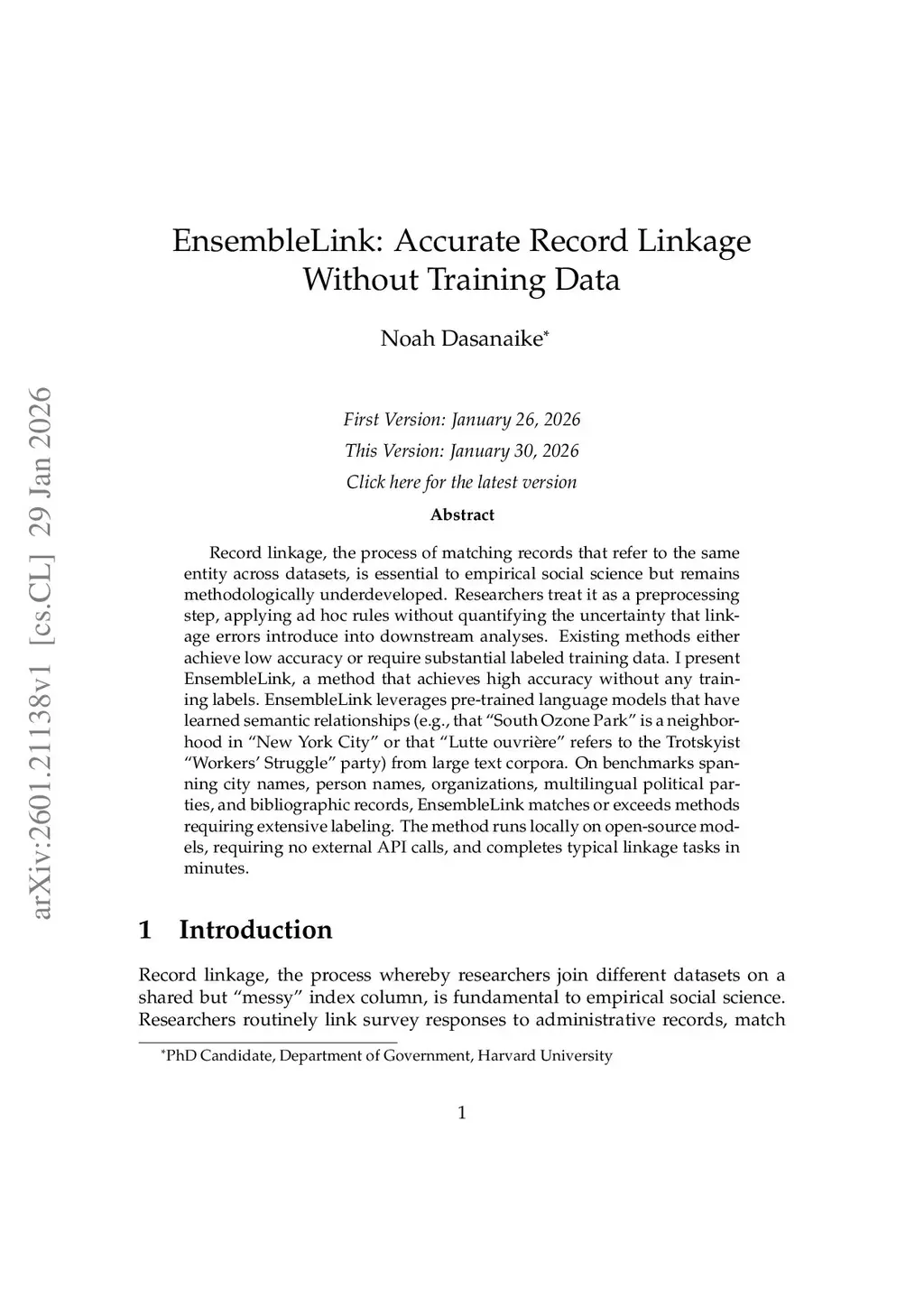 Record linkage, the process of matching records that refer to the same entity across datasets, is essential to empirical social science but remains methodologically underdeveloped. Researchers treat it as a preprocessing step, applying ad hoc rules without quantifying the uncertainty that linkage errors introduce into downstream analyses. Existing methods either achieve low accuracy or require substantial labeled training data. I present EnsembleLink, a method that achieves high accuracy without any training labels. EnsembleLink leverages pre-trained language models that have learned semantic relationships (e.g., that "South Ozone Park" is a neighborhood in "New York City" or that "Lutte ouvriere" refers to the Trotskyist "Workers' Struggle" party) from large text corpora. On benchmarks spanning city names, person names, organizations, multilingual political parties, and bibliographic records, EnsembleLink matches or exceeds methods requiring extensive labeling. The method runs locally on open-source models, requiring no external API calls, and completes typical linkage tasks in minutes.