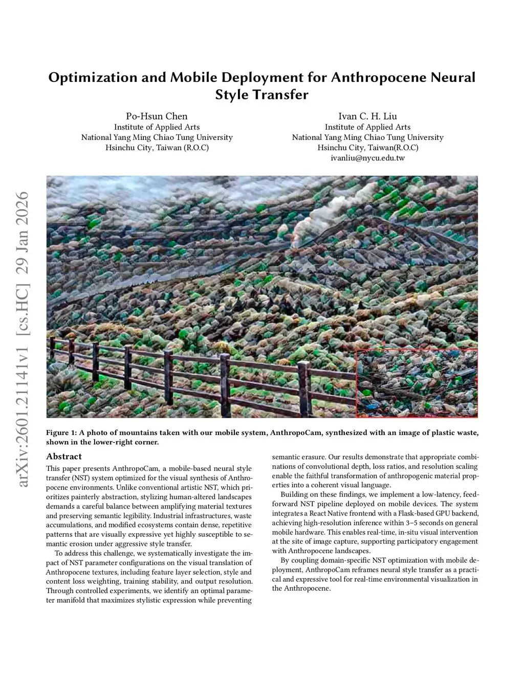 This paper presents AnthropoCam, a mobile-based neural style transfer (NST) system optimized for the visual synthesis of Anthropocene environments. Unlike conventional artistic NST, which prioritizes painterly abstraction, stylizing human-altered landscapes demands a careful balance between amplifying material textures and preserving semantic legibility. Industrial infrastructures, waste accumulations, and modified ecosystems contain dense, repetitive patterns that are visually expressive yet highly susceptible to semantic erosion under aggressive style transfer.To address this challenge, we systematically investigate the impact of NST parameter configurations on the visual translation of Anthropocene textures, including feature layer selection, style and content loss weighting, training stability, and output resolution. Through controlled experiments, we identify an optimal parameter manifold that maximizes stylistic expression while preventing semantic erasure. Our results demonstrate that appropriate combinations of convolutional depth, loss ratios, and resolution scaling enable the faithful transformation of anthropogenic material properties into a coherent visual language.Building on these findings, we implement a low-latency, feed-forward NST pipeline deployed on mobile devices. The system integrates a React Native frontend with a Flask-based GPU backend, achieving high-resolution inference within 3-5 seconds on general mobile hardware. This enables real-time, in-situ visual intervention at the site of image capture, supporting participatory engagement with Anthropocene landscapes.By coupling domain-specific NST optimization with mobile deployment, AnthropoCam reframes neural style transfer as a practical and expressive tool for real-time environmental visualization in the Anthropocene.