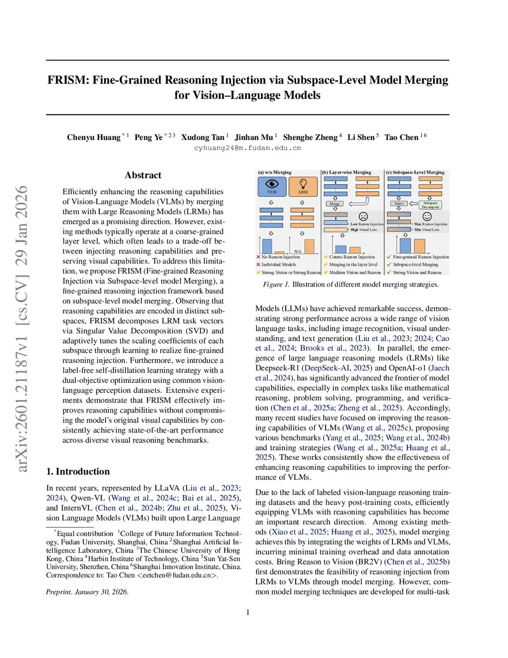 FRISM: Fine-Grained Reasoning Injection via Subspace-Level Model Merging for Vision-Language Models