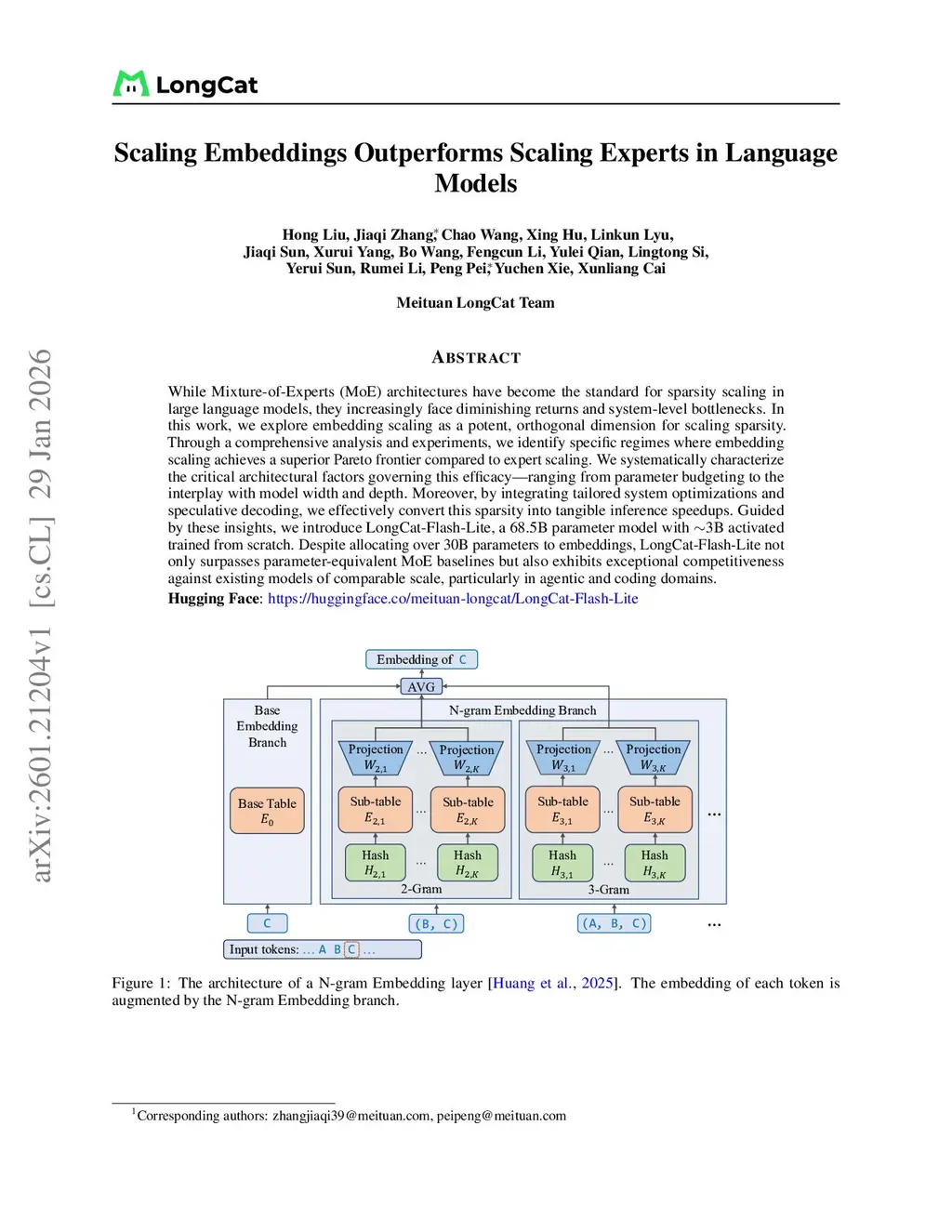 While Mixture-of-Experts (MoE) architectures have become the standard for sparsity scaling in large language models, they increasingly face diminishing returns and system-level bottlenecks. In this work, we explore embedding scaling as a potent, orthogonal dimension for scaling sparsity. Through a comprehensive analysis and experiments, we identify specific regimes where embedding scaling achieves a superior Pareto frontier compared to expert scaling. We systematically characterize the critical architectural factors governing this efficacy -- ranging from parameter budgeting to the interplay with model width and depth. Moreover, by integrating tailored system optimizations and speculative decoding, we effectively convert this sparsity into tangible inference speedups. Guided by these insights, we introduce LongCat-Flash-Lite, a 68.5B parameter model with ~3B activated trained from scratch. Despite allocating over 30B parameters to embeddings, LongCat-Flash-Lite not only surpasses parameter-equivalent MoE baselines but also exhibits exceptional competitiveness against existing models of comparable scale, particularly in agentic and coding domains.