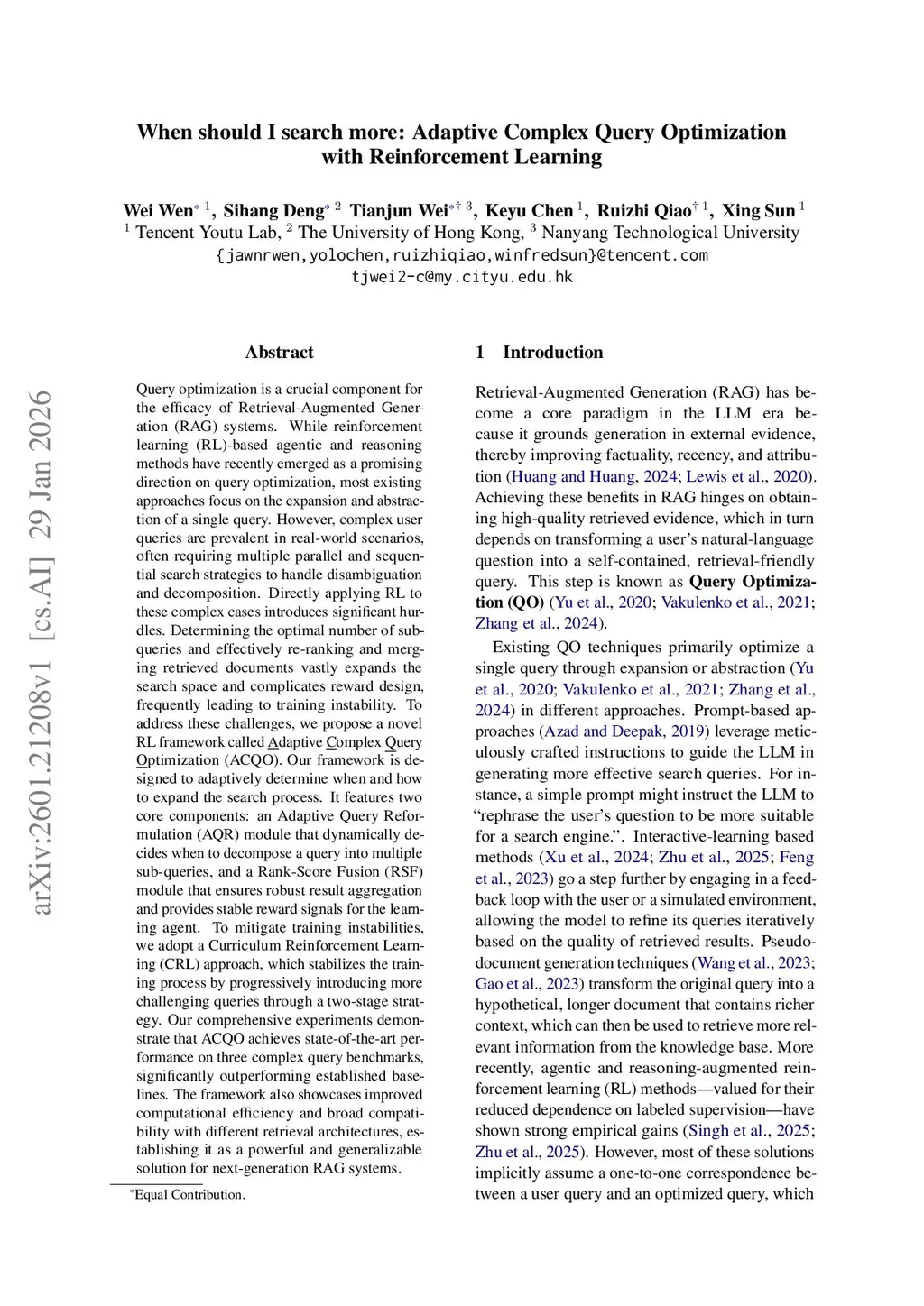 When should I search more: Adaptive Complex Query Optimization with Reinforcement Learning