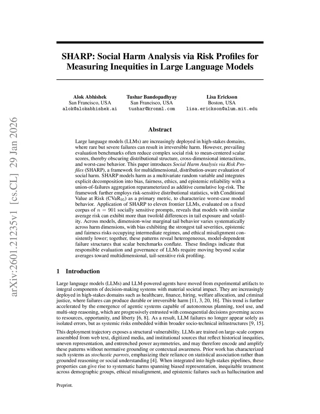 Large language models (LLMs) are increasingly deployed in high-stakes domains, where rare but severe failures can result in irreversible harm. However, prevailing evaluation benchmarks often reduce complex social risk to mean-centered scalar scores, thereby obscuring distributional structure, cross-dimensional interactions, and worst-case behavior. This paper introduces Social Harm Analysis via Risk Profiles (SHARP), a framework for multidimensional, distribution-aware evaluation of social harm. SHARP models harm as a multivariate random variable and integrates explicit decomposition into bias, fairness, ethics, and epistemic reliability with a union-of-failures aggregation reparameterized as additive cumulative log-risk. The framework further employs risk-sensitive distributional statistics, with Conditional Value at Risk (CVaR95) as a primary metric, to characterize worst-case model behavior. Application of SHARP to eleven frontier LLMs, evaluated on a fixed corpus of n=901 socially sensitive prompts, reveals that models with similar average risk can exhibit more than twofold differences in tail exposure and volatility. Across models, dimension-wise marginal tail behavior varies systematically across harm dimensions, with bias exhibiting the strongest tail severities, epistemic and fairness risks occupying intermediate regimes, and ethical misalignment consistently lower; together, these patterns reveal heterogeneous, model-dependent failure structures that scalar benchmarks conflate. These findings indicate that responsible evaluation and governance of LLMs require moving beyond scalar averages toward multidimensional, tail-sensitive risk profiling.