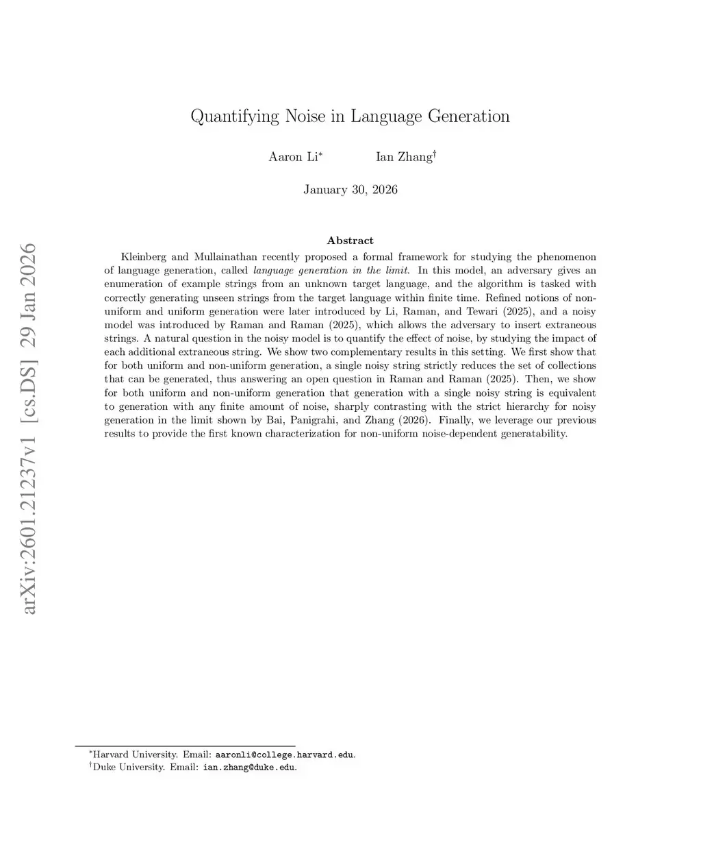 Kleinberg and Mullainathan recently proposed a formal framework for studying the phenomenon of language generation, called language generation in the limit. In this model, an adversary gives an enumeration of example strings from an unknown target language, and the algorithm is tasked with correctly generating unseen strings from the target language within finite time. Refined notions of non-uniform and uniform generation were later introduced by Li, Raman, and Tewari (2025), and a noisy model was introduced by Raman and Raman (2025), which allows the adversary to insert extraneous strings. A natural question in the noisy model is to quantify the effect of noise, by studying the impact of each additional extraneous string. We show two complementary results in this setting. We first show that for both uniform and non-uniform generation, a single noisy string strictly reduces the set of collections that can be generated, thus answering an open question in Raman and Raman (2025). Then, we show for both uniform and non-uniform generation that generation with a single noisy string is equivalent to generation with any finite amount of noise, sharply contrasting with the strict hierarchy for noisy generation in the limit shown by Bai, Panigrahi, and Zhang (2026). Finally, we leverage our previous results to provide the first known characterization for non-uniform noise-dependent generatability.