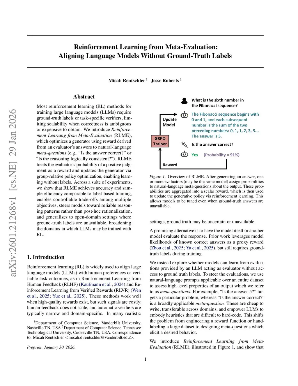 Most reinforcement learning (RL) methods for training large language models (LLMs) require ground-truth labels or task-specific verifiers, limiting scalability when correctness is ambiguous or expensive to obtain. We introduce Reinforcement Learning from Meta-Evaluation (RLME), which optimizes a generator using reward derived from an evaluator's answers to natural-language meta-questions (e.g., "Is the answer correct?" or "Is the reasoning logically consistent?"). RLME treats the evaluator's probability of a positive judgment as a reward and updates the generator via group-relative policy optimization, enabling learning without labels. Across a suite of experiments, we show that RLME achieves accuracy and sample efficiency comparable to label-based training, enables controllable trade-offs among multiple objectives, steers models toward reliable reasoning patterns rather than post-hoc rationalization, and generalizes to open-domain settings where ground-truth labels are unavailable, broadening the domains in which LLMs may be trained with RL.