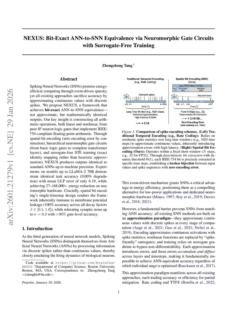 Spiking Neural Networks (SNNs) promise energy-efficient computing through event-driven sparsity, yet all existing approaches sacrifice accuracy by approximating continuous values with discrete spikes. We propose NEXUS, a framework that achieves bit-exact ANN-to-SNN equivalence -- not approximate, but mathematically identical outputs. Our key insight is constructing all arithmetic operations, both linear and nonlinear, from pure IF neuron logic gates that implement IEEE-754 compliant floating-point arithmetic. Through spatial bit encoding (zero encoding error by construction), hierarchical neuromorphic gate circuits (from basic logic gates to complete transformer layers), and surrogate-free STE training (exact identity mapping rather than heuristic approximation), NEXUS produces outputs identical to standard ANNs up to machine precision. Experiments on models up to LLaMA-2 70B demonstrate identical task accuracy (0.00% degradation) with mean ULP error of only 6.19, while achieving 27-168,000 energy reduction on neuromorphic hardware. Crucially, spatial bit encoding's single-timestep design renders the framework inherently immune to membrane potential leakage (100% accuracy across all decay factors ), while tolerating synaptic noise up to with >98% gate-level accuracy.