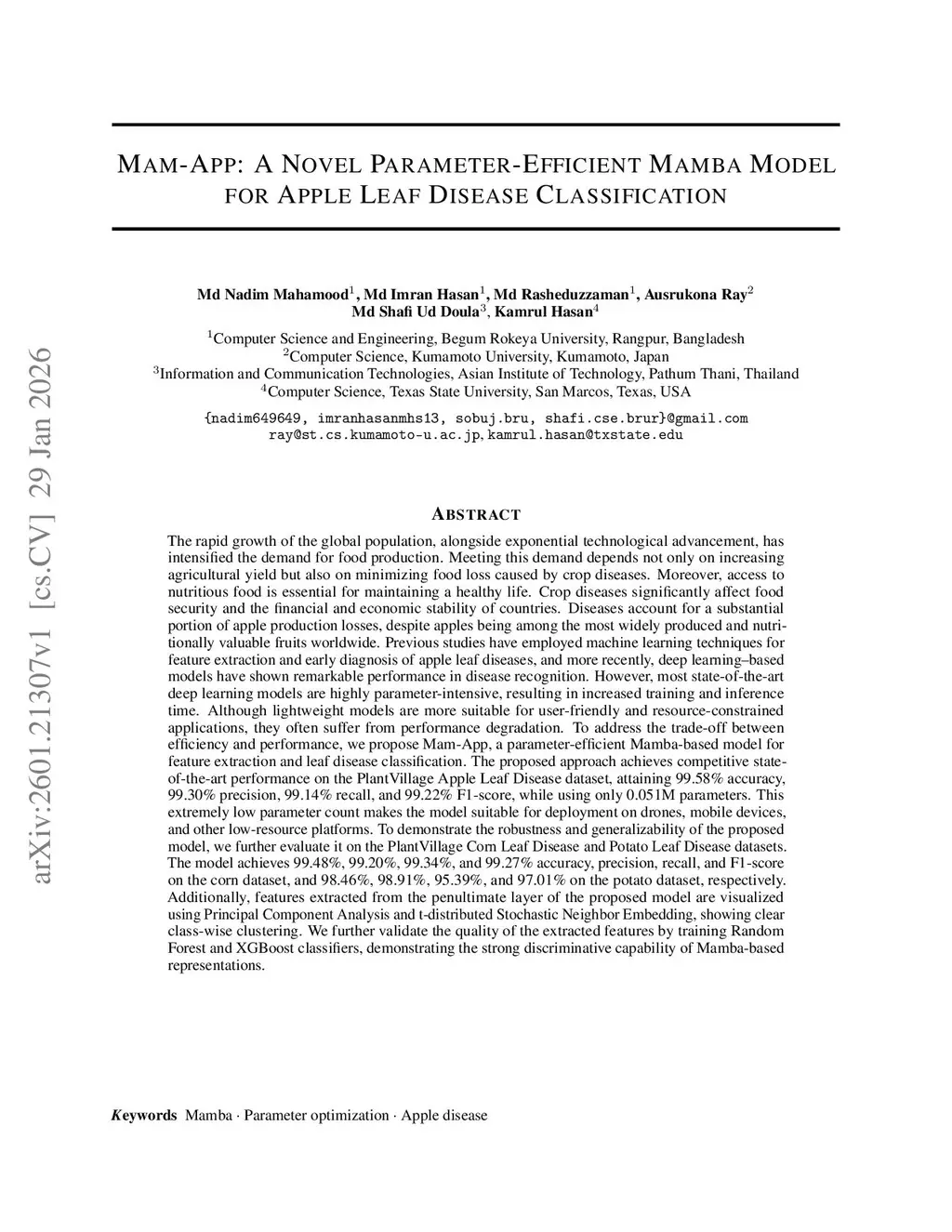 Mam-App: A Novel Parameter-Efficient Mamba Model for Apple Leaf Disease Classification