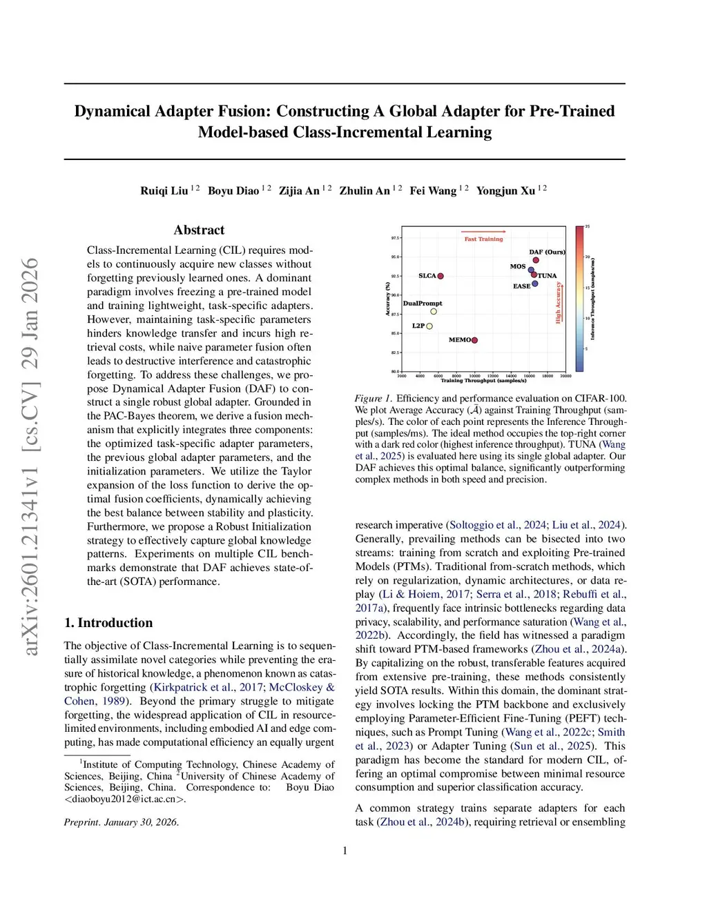Class-Incremental Learning (CIL) requires models to continuously acquire new classes without forgetting previously learned ones. A dominant paradigm involves freezing a pre-trained model and training lightweight, task-specific adapters. However, maintaining task-specific parameters hinders knowledge transfer and incurs high retrieval costs, while naive parameter fusion often leads to destructive interference and catastrophic forgetting. To address these challenges, we propose Dynamical Adapter Fusion (DAF) to construct a single robust global adapter. Grounded in the PAC-Bayes theorem, we derive a fusion mechanism that explicitly integrates three components: the optimized task-specific adapter parameters, the previous global adapter parameters, and the initialization parameters. We utilize the Taylor expansion of the loss function to derive the optimal fusion coefficients, dynamically achieving the best balance between stability and plasticity. Furthermore, we propose a Robust Initialization strategy to effectively capture global knowledge patterns. Experiments on multiple CIL benchmarks demonstrate that DAF achieves state-of-the-art (SOTA) performance.