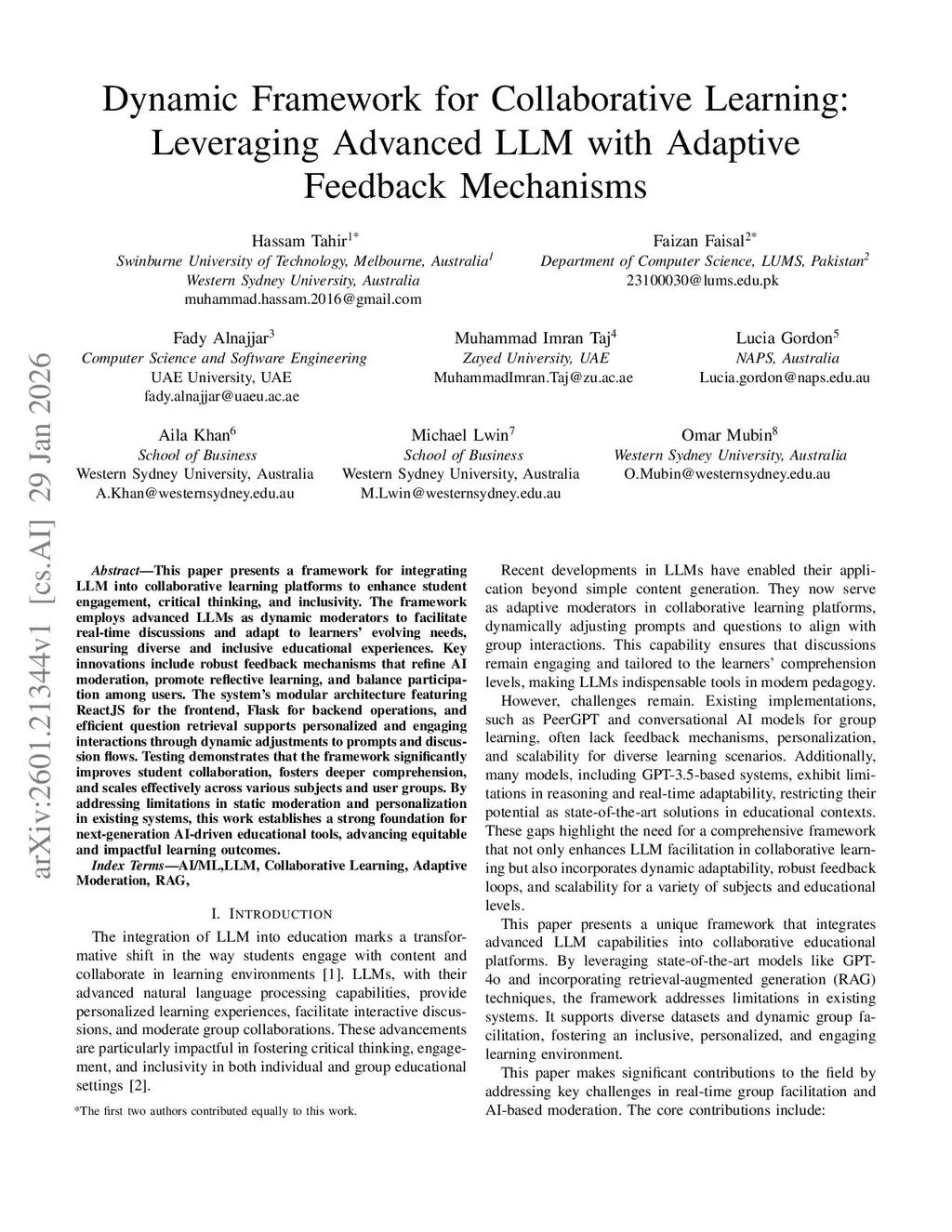 This paper presents a framework for integrating LLM into collaborative learning platforms to enhance student engagement, critical thinking, and inclusivity. The framework employs advanced LLMs as dynamic moderators to facilitate real-time discussions and adapt to learners' evolving needs, ensuring diverse and inclusive educational experiences. Key innovations include robust feedback mechanisms that refine AI moderation, promote reflective learning, and balance participation among users. The system's modular architecture featuring ReactJS for the frontend, Flask for backend operations, and efficient question retrieval supports personalized and engaging interactions through dynamic adjustments to prompts and discussion flows. Testing demonstrates that the framework significantly improves student collaboration, fosters deeper comprehension, and scales effectively across various subjects and user groups. By addressing limitations in static moderation and personalization in existing systems, this work establishes a strong foundation for next-generation AI-driven educational tools, advancing equitable and impactful learning outcomes.