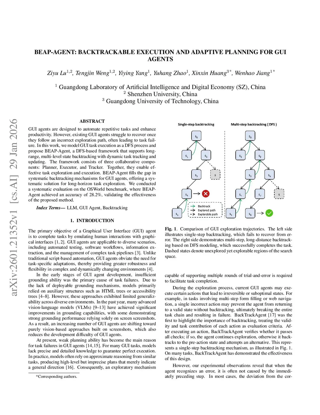 GUI agents are designed to automate repetitive tasks and enhance productivity. However, existing GUI agents struggle to recover once they follow an incorrect exploration path, often leading to task failure. In this work, we model GUI task execution as a DFS process and propose BEAP-Agent, a DFS-based framework that supports long-range, multi-level state backtracking with dynamic task tracking and updating. The framework consists of three collaborative components: Planner, Executor, and Tracker. Together, they enable effective task exploration and execution. BEAP-Agent fills the gap in systematic backtracking mechanisms for GUI agents, offering a systematic solution for long-horizon task exploration. We conducted a systematic evaluation on the OSWorld benchmark, where BEAP-Agent achieved an accuracy of 28.2%, validating the effectiveness of the proposed method.