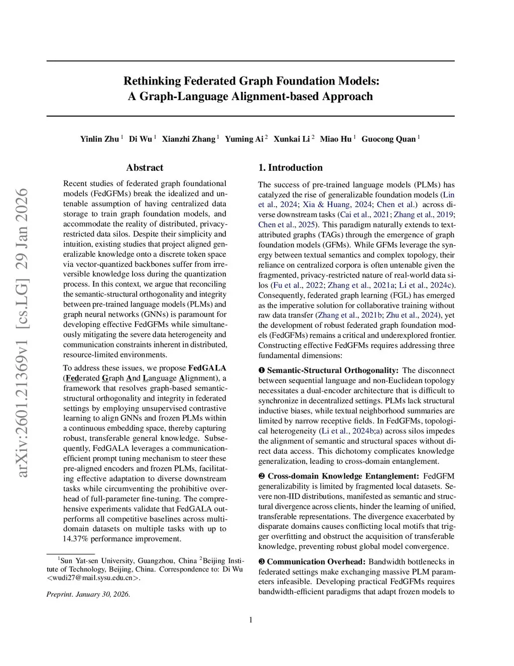 Recent studies of federated graph foundational models (FedGFMs) break the idealized and untenable assumption of having centralized data storage to train graph foundation models, and accommodate the reality of distributed, privacy-restricted data silos. Despite their simplicity and intuition, existing studies that project aligned generalizable knowledge onto a discrete token space via vector-quantized backbones suffer from irreversible knowledge loss during the quantization process. In this context, we argue that reconciling the semantic-structural orthogonality and integrity between pre-trained language models (PLMs) and graph neural networks (GNNs) is paramount for developing effective FedGFMs while simultaneously mitigating the severe data heterogeneity and communication constraints inherent in distributed, resource-limited environments.To address these issues, we propose FedGALA (Federated Graph And Language Alignment), a framework that resolves graph-based semantic-structural orthogonality and integrity in federated settings by employing unsupervised contrastive learning to align GNNs and frozen PLMs within a continuous embedding space, thereby capturing robust, transferable general knowledge. Subsequently, FedGALA leverages a communication-efficient prompt tuning mechanism to steer these pre-aligned encoders and frozen PLMs, facilitating effective adaptation to diverse downstream tasks while circumventing the prohibitive overhead of full-parameter fine-tuning. The comprehensive experiments validate that FedGALA outperforms all competitive baselines across multi-domain datasets on multiple tasks with up to 14.37% performance improvement.