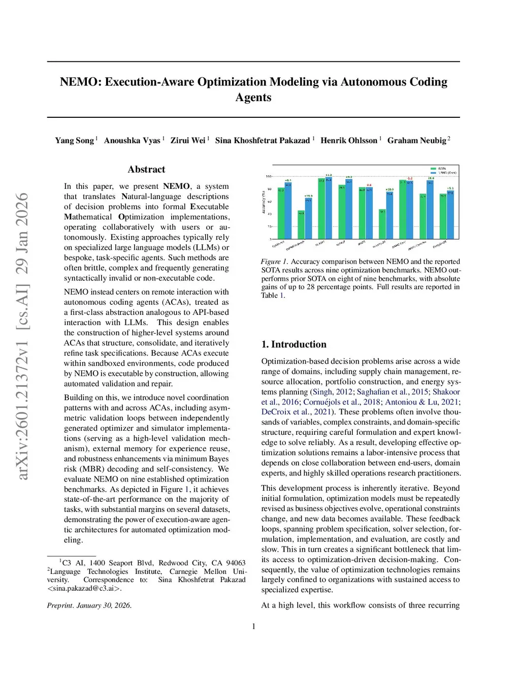 In this paper, we present NEMO, a system that translates Natural-language descriptions of decision problems into formal Executable Mathematical Optimization implementations, operating collaboratively with users or autonomously. Existing approaches typically rely on specialized large language models (LLMs) or bespoke, task-specific agents. Such methods are often brittle, complex and frequently generating syntactically invalid or non-executable code.NEMO instead centers on remote interaction with autonomous coding agents (ACAs), treated as a first-class abstraction analogous to API-based interaction with LLMs. This design enables the construction of higher-level systems around ACAs that structure, consolidate, and iteratively refine task specifications. Because ACAs execute within sandboxed environments, code produced by NEMO is executable by construction, allowing automated validation and repair.Building on this, we introduce novel coordination patterns with and across ACAs, including asymmetric validation loops between independently generated optimizer and simulator implementations (serving as a high-level validation mechanism), external memory for experience reuse, and robustness enhancements via minimum Bayes risk (MBR) decoding and self-consistency. We evaluate NEMO on nine established optimization benchmarks. As depicted in Figure 1, it achieves state-of-the-art performance on the majority of tasks, with substantial margins on several datasets, demonstrating the power of execution-aware agentic architectures for automated optimization modeling.
