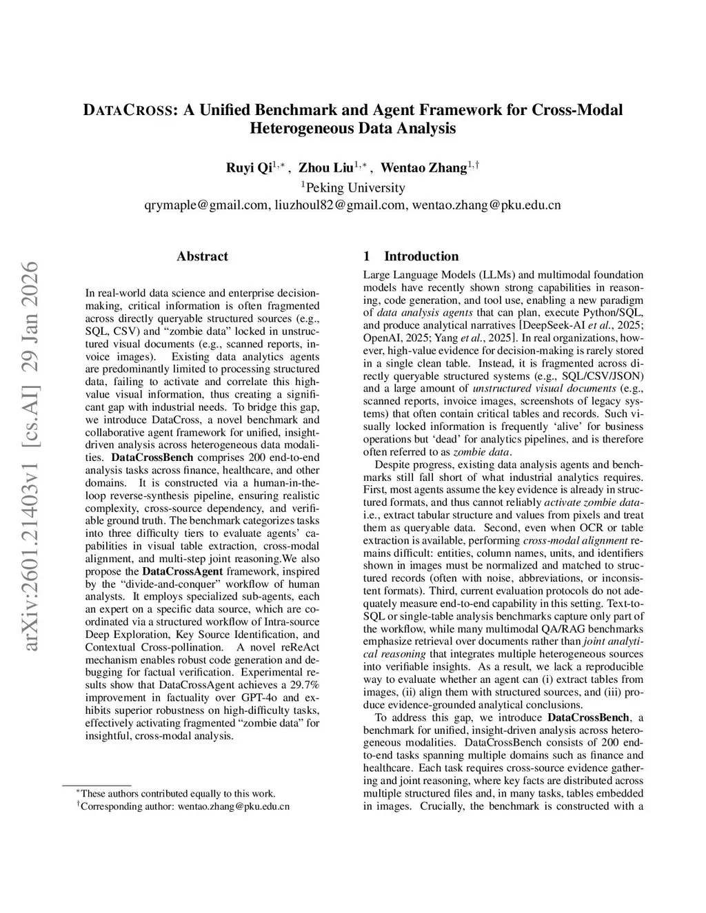 In real-world data science and enterprise decision-making, critical information is often fragmented across directly queryable structured sources (e.g., SQL, CSV) and "zombie data" locked in unstructured visual documents (e.g., scanned reports, invoice images). Existing data analytics agents are predominantly limited to processing structured data, failing to activate and correlate this high-value visual information, thus creating a significant gap with industrial needs. To bridge this gap, we introduce DataCross, a novel benchmark and collaborative agent framework for unified, insight-driven analysis across heterogeneous data modalities. DataCrossBench comprises 200 end-to-end analysis tasks across finance, healthcare, and other domains. It is constructed via a human-in-the-loop reverse-synthesis pipeline, ensuring realistic complexity, cross-source dependency, and verifiable ground truth. The benchmark categorizes tasks into three difficulty tiers to evaluate agents' capabilities in visual table extraction, cross-modal alignment, and multi-step joint reasoning. We also propose the DataCrossAgent framework, inspired by the "divide-and-conquer" workflow of human analysts. It employs specialized sub-agents, each an expert on a specific data source, which are coordinated via a structured workflow of Intra-source Deep Exploration, Key Source Identification, and Contextual Cross-pollination. A novel reReAct mechanism enables robust code generation and debugging for factual verification. Experimental results show that DataCrossAgent achieves a 29.7% improvement in factuality over GPT-4o and exhibits superior robustness on high-difficulty tasks, effectively activating fragmented "zombie data" for insightful, cross-modal analysis.