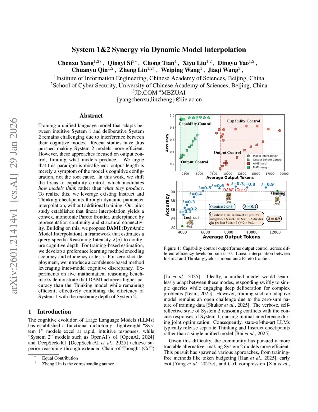 Training a unified language model that adapts between intuitive System 1 and deliberative System 2 remains challenging due to interference between their cognitive modes. Recent studies have thus pursued making System 2 models more efficient. However, these approaches focused on output control, limiting what models produce. We argue that this paradigm is misaligned: output length is merely a symptom of the model's cognitive configuration, not the root cause. In this work, we shift the focus to capability control, which modulates \textit{how models think} rather than \textit{what they produce}. To realize this, we leverage existing Instruct and Thinking checkpoints through dynamic parameter interpolation, without additional training. Our pilot study establishes that linear interpolation yields a convex, monotonic Pareto frontier, underpinned by representation continuity and structural connectivity. Building on this, we propose \textbf{DAMI} (\textbf{D}yn\textbf{A}mic \textbf{M}odel \textbf{I}nterpolation), a framework that estimates a query-specific Reasoning Intensity to configure cognitive depth. For training-based estimation, we develop a preference learning method encoding accuracy and efficiency criteria. For zero-shot deployment, we introduce a confidence-based method leveraging inter-model cognitive discrepancy. Experiments on five mathematical reasoning benchmarks demonstrate that DAMI achieves higher accuracy than the Thinking model while remaining efficient, effectively combining the efficiency of System 1 with the reasoning depth of System 2.