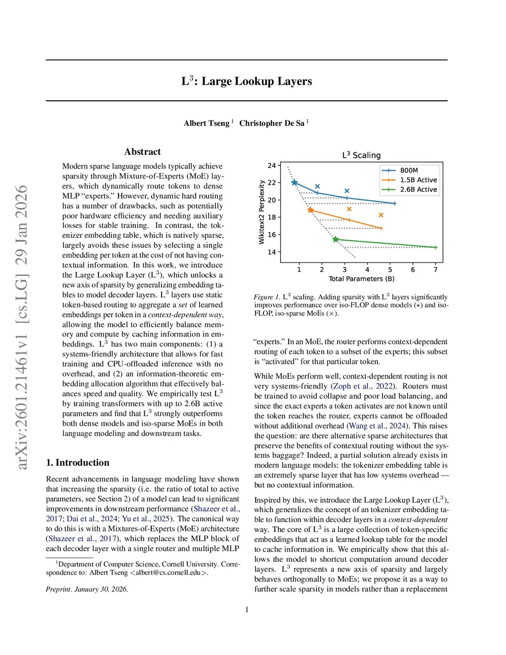 Modern sparse language models typically achieve sparsity through Mixture-of-Experts (MoE) layers, which dynamically route tokens to dense MLP "experts." However, dynamic hard routing has a number of drawbacks, such as potentially poor hardware efficiency and needing auxiliary losses for stable training. In contrast, the tokenizer embedding table, which is natively sparse, largely avoids these issues by selecting a single embedding per token at the cost of not having contextual information. In this work, we introduce the Large Lookup Layer (L), which unlocks a new axis of sparsity by generalizing embedding tables to model decoder layers. L layers use static token-based routing to aggregate a set of learned embeddings per token in a context-dependent way, allowing the model to efficiently balance memory and compute by caching information in embeddings. L has two main components: (1) a systems-friendly architecture that allows for fast training and CPU-offloaded inference with no overhead, and (2) an information-theoretic embedding allocation algorithm that effectively balances speed and quality. We empirically test L by training transformers with up to 2.6B active parameters and find that L strongly outperforms both dense models and iso-sparse MoEs in both language modeling and downstream tasks.