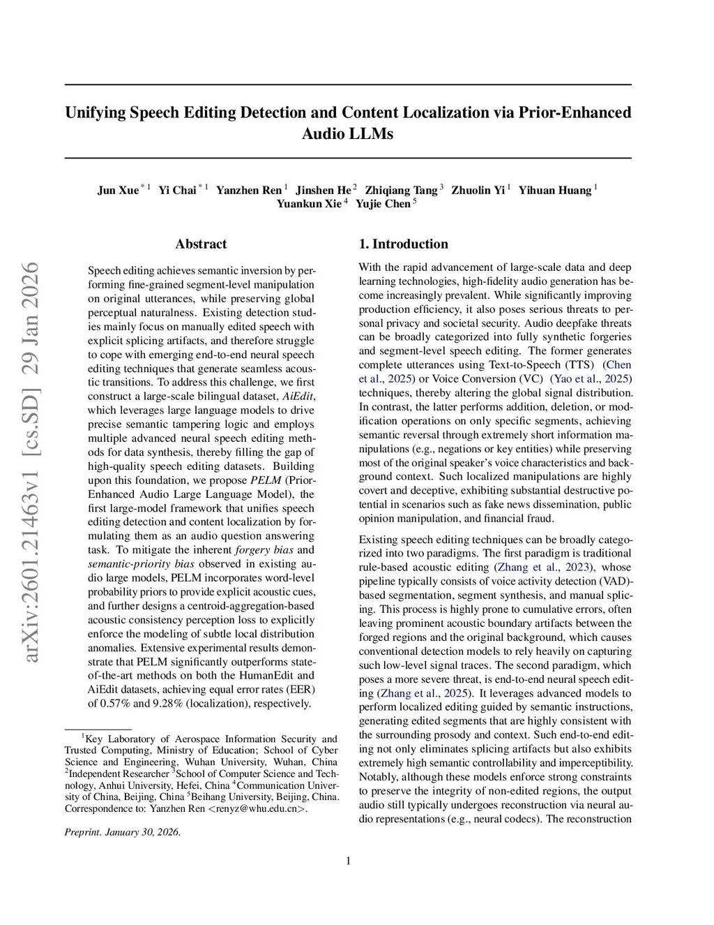Speech editing achieves semantic inversion by performing fine-grained segment-level manipulation on original utterances, while preserving global perceptual naturalness. Existing detection studies mainly focus on manually edited speech with explicit splicing artifacts, and therefore struggle to cope with emerging end-to-end neural speech editing techniques that generate seamless acoustic transitions. To address this challenge, we first construct a large-scale bilingual dataset, AiEdit, which leverages large language models to drive precise semantic tampering logic and employs multiple advanced neural speech editing methods for data synthesis, thereby filling the gap of high-quality speech editing datasets. Building upon this foundation, we propose PELM (Prior-Enhanced Audio Large Language Model), the first large-model framework that unifies speech editing detection and content localization by formulating them as an audio question answering task. To mitigate the inherent forgery bias and semantic-priority bias observed in existing audio large models, PELM incorporates word-level probability priors to provide explicit acoustic cues, and further designs a centroid-aggregation-based acoustic consistency perception loss to explicitly enforce the modeling of subtle local distribution anomalies. Extensive experimental results demonstrate that PELM significantly outperforms state-of-the-art methods on both the HumanEdit and AiEdit datasets, achieving equal error rates (EER) of 0.57\% and 9.28\% (localization), respectively.