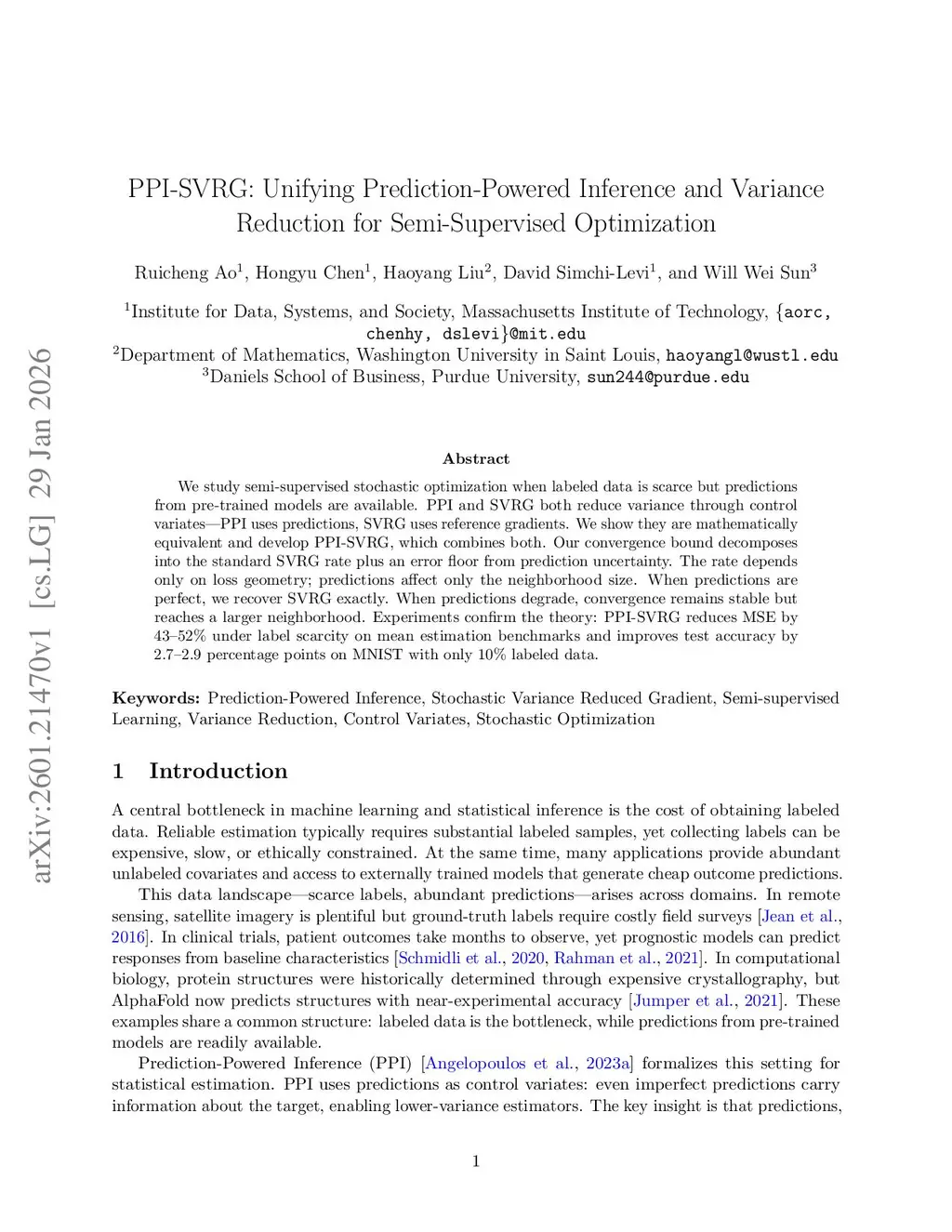 We study semi-supervised stochastic optimization when labeled data is scarce but predictions from pre-trained models are available. PPI and SVRG both reduce variance through control variates -- PPI uses predictions, SVRG uses reference gradients. We show they are mathematically equivalent and develop PPI-SVRG, which combines both. Our convergence bound decomposes into the standard SVRG rate plus an error floor from prediction uncertainty. The rate depends only on loss geometry; predictions affect only the neighborhood size. When predictions are perfect, we recover SVRG exactly. When predictions degrade, convergence remains stable but reaches a larger neighborhood. Experiments confirm the theory: PPI-SVRG reduces MSE by 43--52\% under label scarcity on mean estimation benchmarks and improves test accuracy by 2.7--2.9 percentage points on MNIST with only 10\% labeled data.