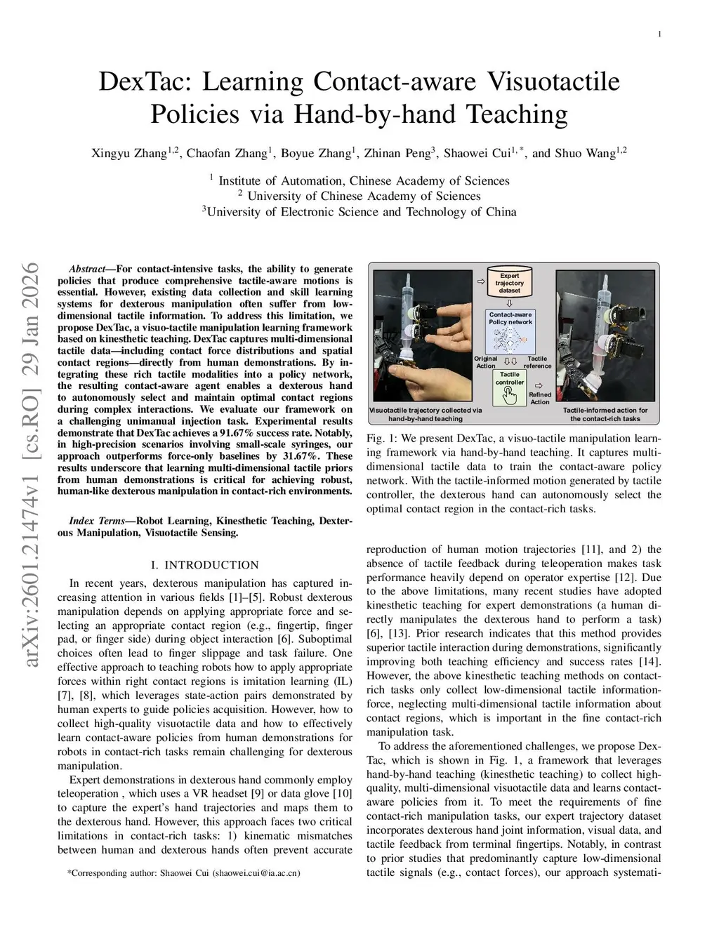 For contact-intensive tasks, the ability to generate policies that produce comprehensive tactile-aware motions is essential. However, existing data collection and skill learning systems for dexterous manipulation often suffer from low-dimensional tactile information. To address this limitation, we propose DexTac, a visuo-tactile manipulation learning framework based on kinesthetic teaching. DexTac captures multi-dimensional tactile data-including contact force distributions and spatial contact regions-directly from human demonstrations. By integrating these rich tactile modalities into a policy network, the resulting contact-aware agent enables a dexterous hand to autonomously select and maintain optimal contact regions during complex interactions. We evaluate our framework on a challenging unimanual injection task. Experimental results demonstrate that DexTac achieves a 91.67% success rate. Notably, in high-precision scenarios involving small-scale syringes, our approach outperforms force-only baselines by 31.67%. These results underscore that learning multi-dimensional tactile priors from human demonstrations is critical for achieving robust, human-like dexterous manipulation in contact-rich environments.