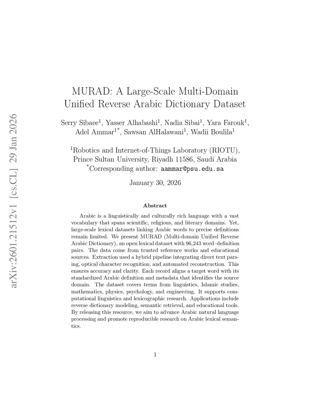 Arabic is a linguistically and culturally rich language with a vast vocabulary that spans scientific, religious, and literary domains. Yet, large-scale lexical datasets linking Arabic words to precise definitions remain limited. We present MURAD (Multi-domain Unified Reverse Arabic Dictionary), an open lexical dataset with 96,243 word-definition pairs. The data come from trusted reference works and educational sources. Extraction used a hybrid pipeline integrating direct text parsing, optical character recognition, and automated reconstruction. This ensures accuracy and clarity. Each record aligns a target word with its standardized Arabic definition and metadata that identifies the source domain. The dataset covers terms from linguistics, Islamic studies, mathematics, physics, psychology, and engineering. It supports computational linguistics and lexicographic research. Applications include reverse dictionary modeling, semantic retrieval, and educational tools. By releasing this resource, we aim to advance Arabic natural language processing and promote reproducible research on Arabic lexical semantics.