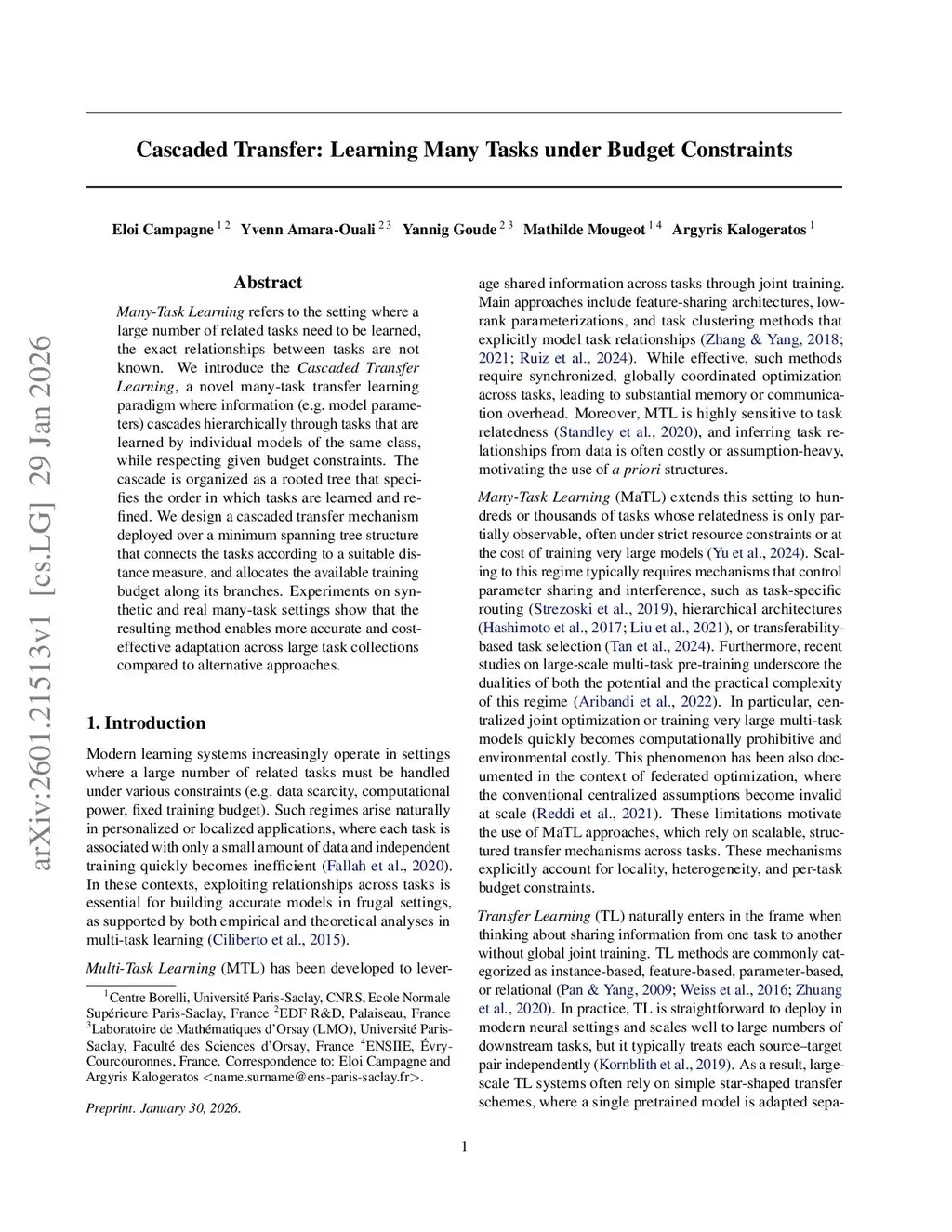 Many-Task Learning refers to the setting where a large number of related tasks need to be learned, the exact relationships between tasks are not known. We introduce the Cascaded Transfer Learning, a novel many-task transfer learning paradigm where information (e.g. model parameters) cascades hierarchically through tasks that are learned by individual models of the same class, while respecting given budget constraints. The cascade is organized as a rooted tree that specifies the order in which tasks are learned and refined. We design a cascaded transfer mechanism deployed over a minimum spanning tree structure that connects the tasks according to a suitable distance measure, and allocates the available training budget along its branches. Experiments on synthetic and real many-task settings show that the resulting method enables more accurate and cost effective adaptation across large task collections compared to alternative approaches.
