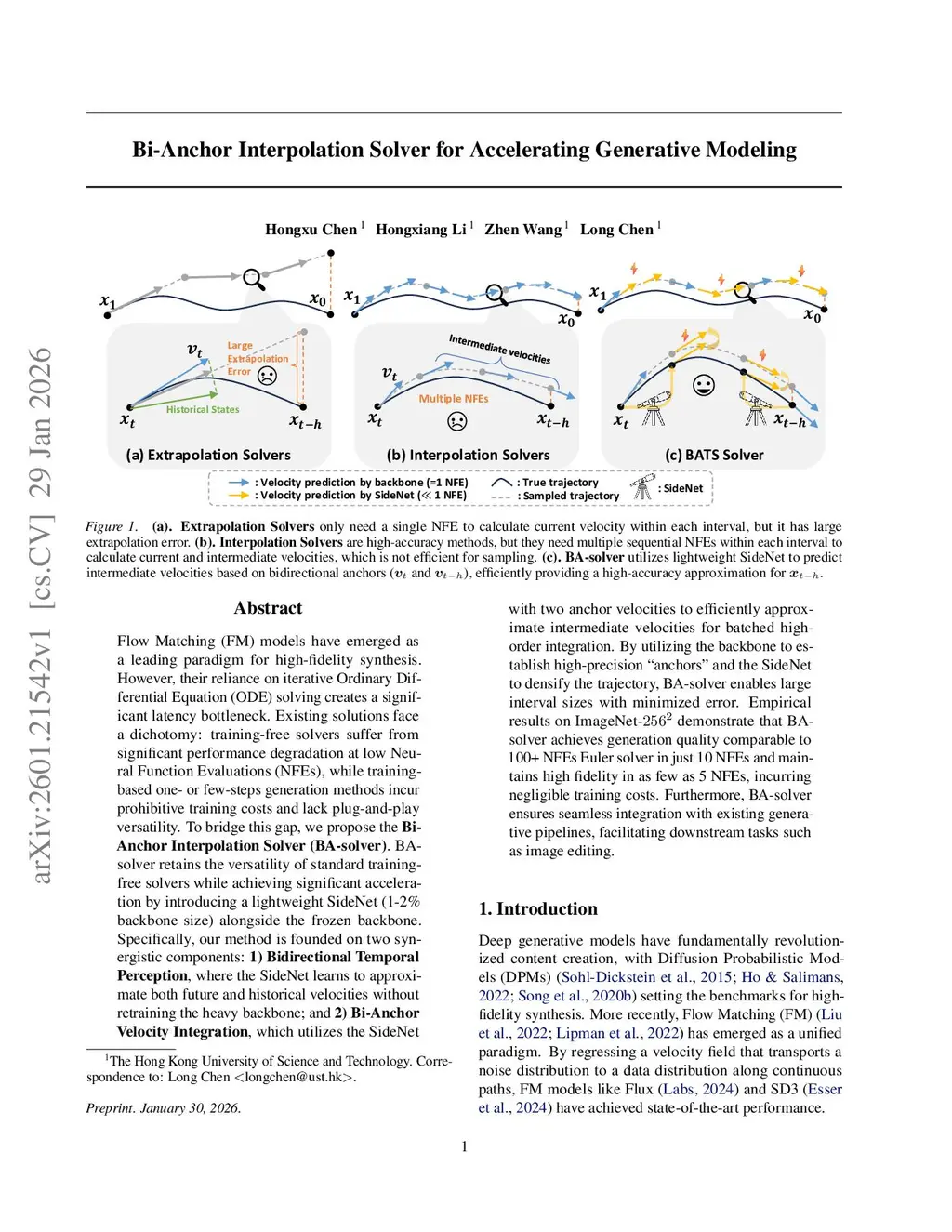 Flow Matching (FM) models have emerged as a leading paradigm for high-fidelity synthesis. However, their reliance on iterative Ordinary Differential Equation (ODE) solving creates a significant latency bottleneck. Existing solutions face a dichotomy: training-free solvers suffer from significant performance degradation at low Neural Function Evaluations (NFEs), while training-based one- or few-steps generation methods incur prohibitive training costs and lack plug-and-play versatility. To bridge this gap, we propose the Bi-Anchor Interpolation Solver (BA-solver). BA-solver retains the versatility of standard training-free solvers while achieving significant acceleration by introducing a lightweight SideNet (1-2% backbone size) alongside the frozen backbone. Specifically, our method is founded on two synergistic components: \textbf{1) Bidirectional Temporal Perception}, where the SideNet learns to approximate both future and historical velocities without retraining the heavy backbone; and 2) Bi-Anchor Velocity Integration, which utilizes the SideNet with two anchor velocities to efficiently approximate intermediate velocities for batched high-order integration. By utilizing the backbone to establish high-precision ``anchors'' and the SideNet to densify the trajectory, BA-solver enables large interval sizes with minimized error. Empirical results on ImageNet-256^2 demonstrate that BA-solver achieves generation quality comparable to 100+ NFEs Euler solver in just 10 NFEs and maintains high fidelity in as few as 5 NFEs, incurring negligible training costs. Furthermore, BA-solver ensures seamless integration with existing generative pipelines, facilitating downstream tasks such as image editing.