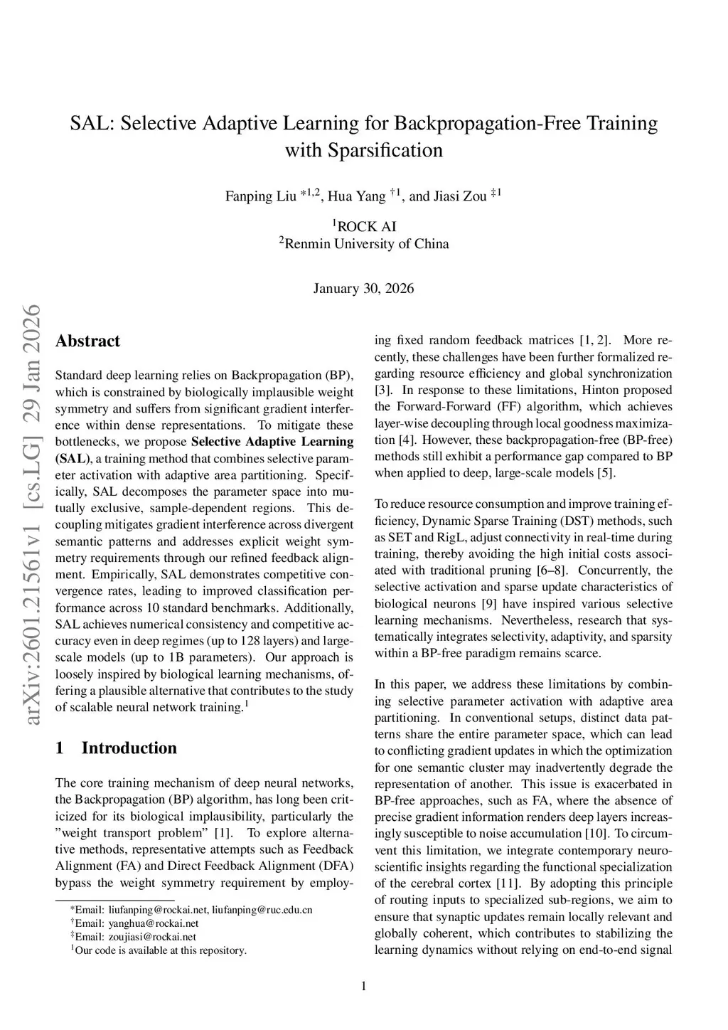 SAL: Selective Adaptive Learning for Backpropagation-Free Training with Sparsification