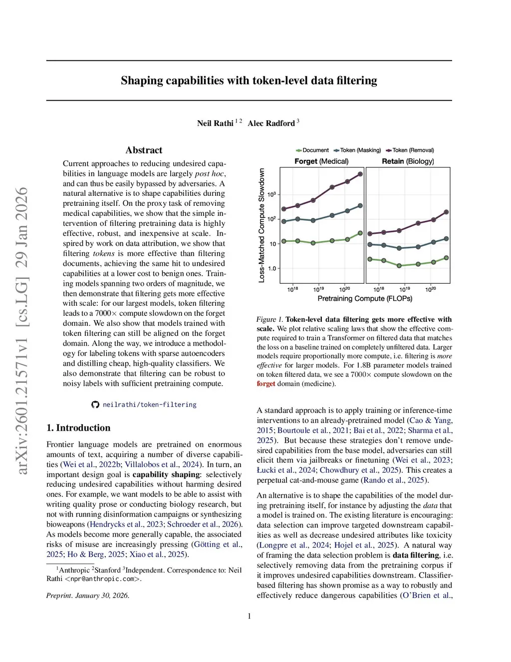 Current approaches to reducing undesired capabilities in language models are largely post hoc, and can thus be easily bypassed by adversaries. A natural alternative is to shape capabilities during pretraining itself. On the proxy task of removing medical capabilities, we show that the simple intervention of filtering pretraining data is highly effective, robust, and inexpensive at scale. Inspired by work on data attribution, we show that filtering tokens is more effective than filtering documents, achieving the same hit to undesired capabilities at a lower cost to benign ones. Training models spanning two orders of magnitude, we then demonstrate that filtering gets more effective with scale: for our largest models, token filtering leads to a 7000x compute slowdown on the forget domain. We also show that models trained with token filtering can still be aligned on the forget domain. Along the way, we introduce a methodology for labeling tokens with sparse autoencoders and distilling cheap, high-quality classifiers. We also demonstrate that filtering can be robust to noisy labels with sufficient pretraining compute.