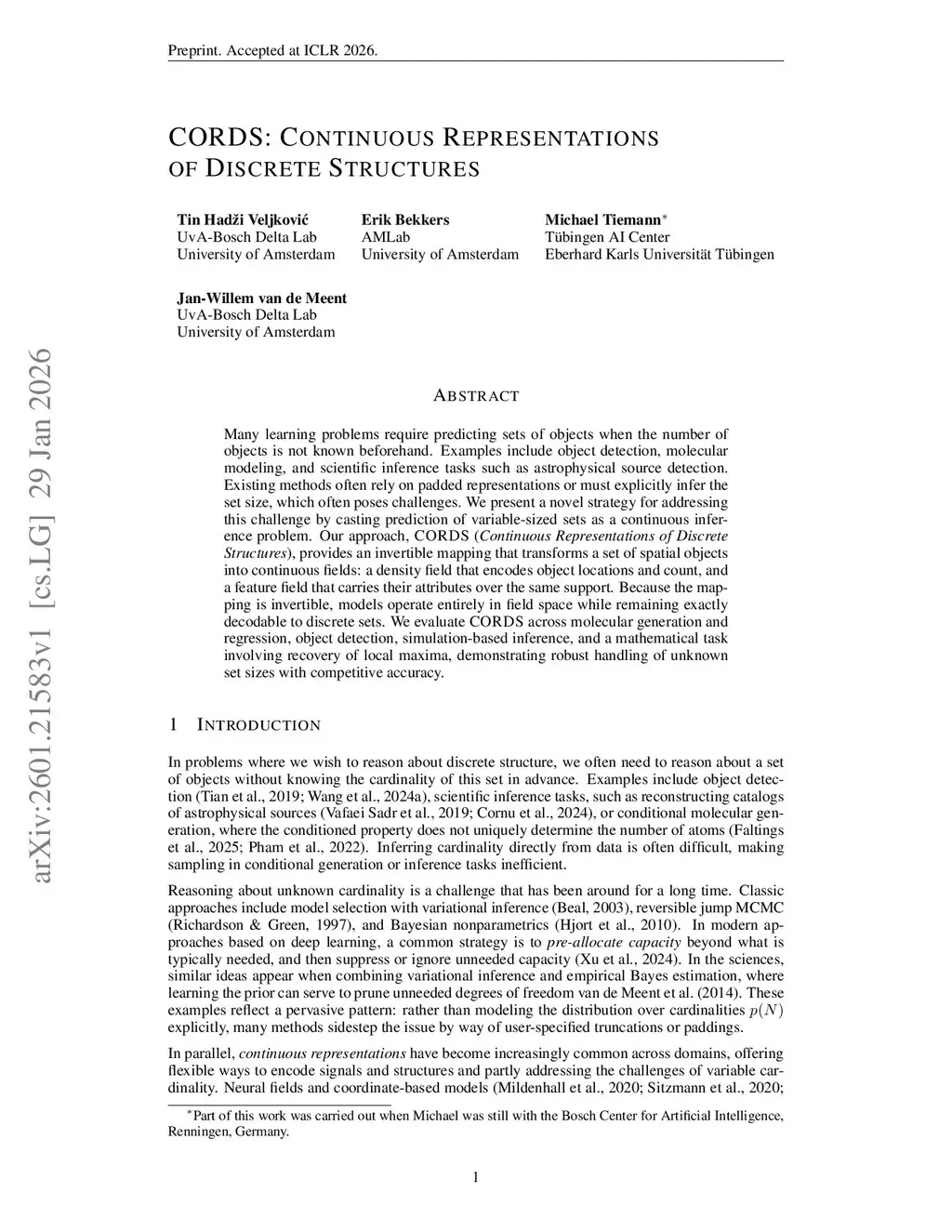 Many learning problems require predicting sets of objects when the number of objects is not known beforehand. Examples include object detection, molecular modeling, and scientific inference tasks such as astrophysical source detection. Existing methods often rely on padded representations or must explicitly infer the set size, which often poses challenges. We present a novel strategy for addressing this challenge by casting prediction of variable-sized sets as a continuous inference problem. Our approach, CORDS (Continuous Representations of Discrete Structures), provides an invertible mapping that transforms a set of spatial objects into continuous fields: a density field that encodes object locations and count, and a feature field that carries their attributes over the same support. Because the mapping is invertible, models operate entirely in field space while remaining exactly decodable to discrete sets. We evaluate CORDS across molecular generation and regression, object detection, simulation-based inference, and a mathematical task involving recovery of local maxima, demonstrating robust handling of unknown set sizes with competitive accuracy.