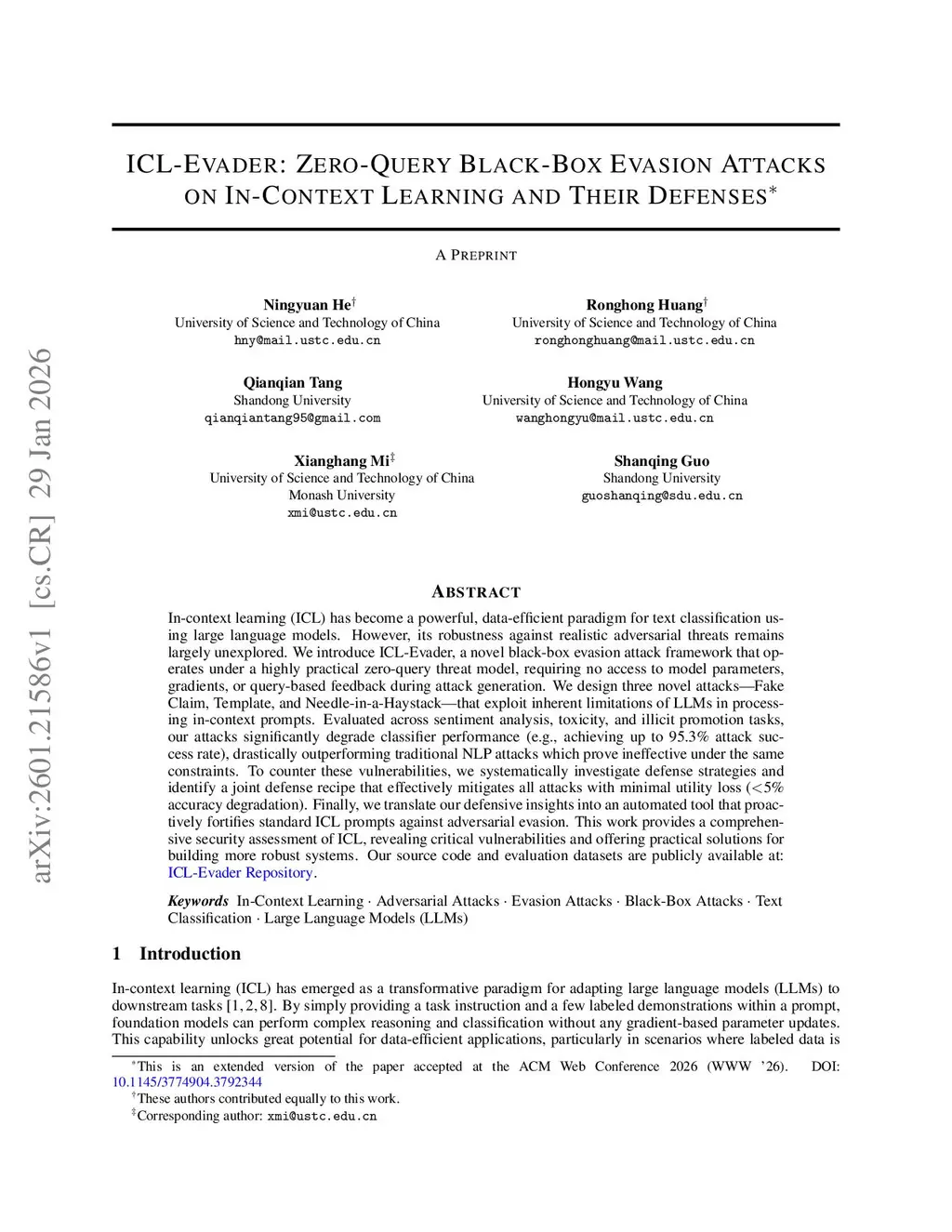 In-context learning (ICL) has become a powerful, data-efficient paradigm for text classification using large language models. However, its robustness against realistic adversarial threats remains largely unexplored. We introduce ICL-Evader, a novel black-box evasion attack framework that operates under a highly practical zero-query threat model, requiring no access to model parameters, gradients, or query-based feedback during attack generation. We design three novel attacks, Fake Claim, Template, and Needle-in-a-Haystack, that exploit inherent limitations of LLMs in processing in-context prompts. Evaluated across sentiment analysis, toxicity, and illicit promotion tasks, our attacks significantly degrade classifier performance (e.g., achieving up to 95.3% attack success rate), drastically outperforming traditional NLP attacks which prove ineffective under the same constraints. To counter these vulnerabilities, we systematically investigate defense strategies and identify a joint defense recipe that effectively mitigates all attacks with minimal utility loss (<5% accuracy degradation). Finally, we translate our defensive insights into an automated tool that proactively fortifies standard ICL prompts against adversarial evasion. This work provides a comprehensive security assessment of ICL, revealing critical vulnerabilities and offering practical solutions for building more robust systems. Our source code and evaluation datasets are publicly available at:this https URL.